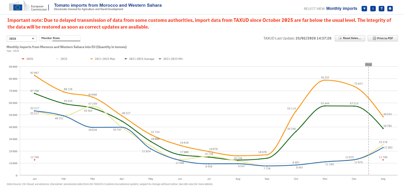 El portal de datos sobre importaciones de tomates procedentes del Sáhara Occidental y Marruecos de la Dirección General de Agricultura y Desarrollo Rural de la Comisión Europea incluye una anotación en la que se indica que “debido al retraso en la transmisión de datos de algunas autoridades aduaneras, los datos de importación de TAXUD (organismo encargado de la unión aduanera) desde octubre de 2025 están muy por debajo del nivel habitual”. También se añade que “la integridad de los datos se restablecerá tan pronto como se disponga de actualizaciones correctas”. A 26 de febrero, la Comisión Europea no ha respondido a las consultas de Maldita.es para aclarar a qué países corresponden las autoridades aduaneras pendientes de enviar los datos.