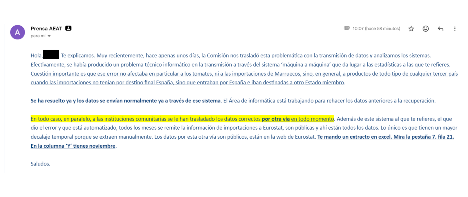 En el caso de España, Aduanas explicó a Maldita.es que se había producido un problema técnico informático en la transmisión de información desde los Estados a la Comisión mediante el sistema “máquina a máquina” utilizado para generar las estadísticas. Además explicaron que el fallo afectó a productos de todo tipo procedentes de todos los terceros países que entraban por territorio español con destino a otro Estado miembro, y no solo a tomates de Marruecos y del Sáhara.