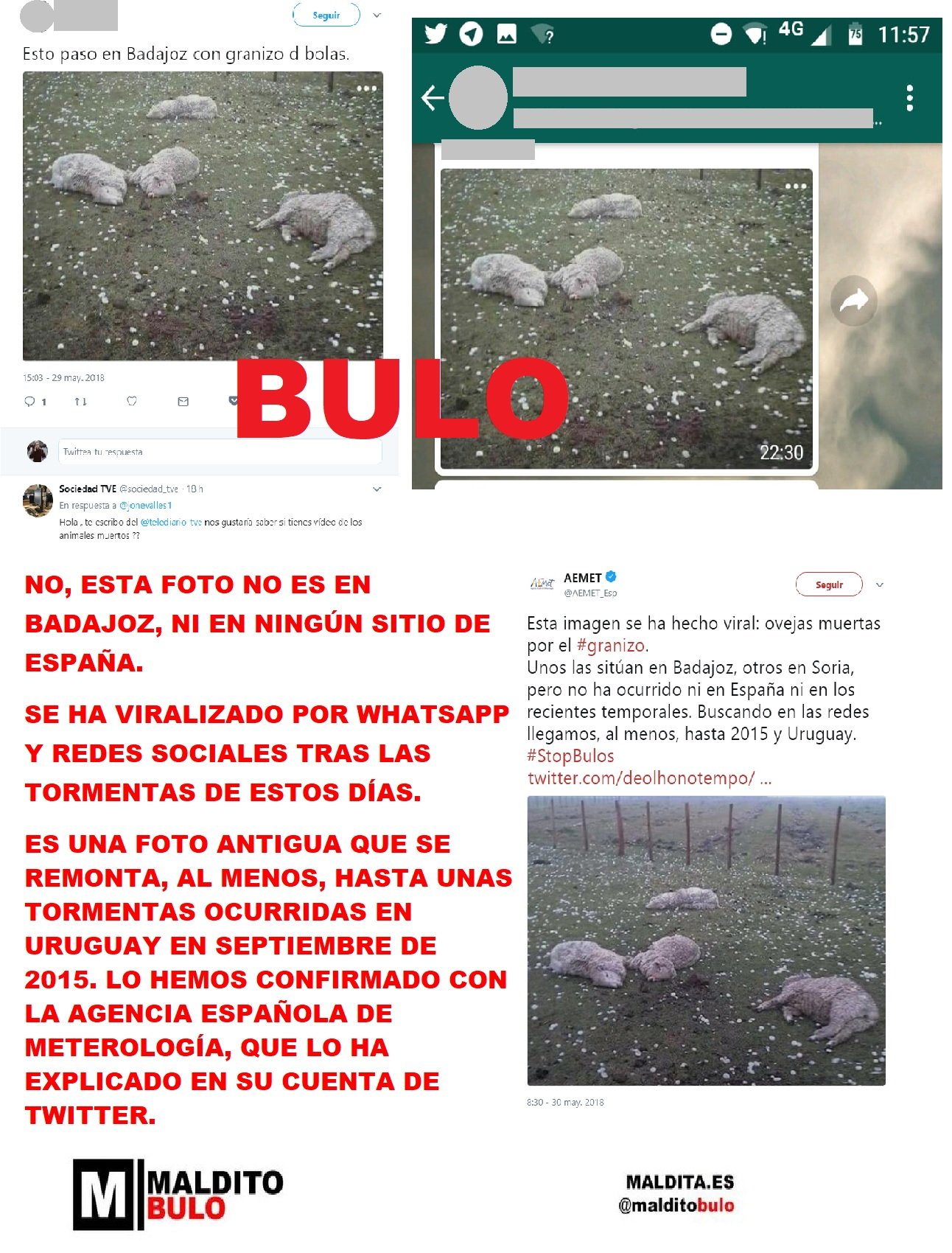 NO. Esta foto de ovejas muertas por granizo no es de Badajoz ni de ningún sitio de España. Es una foto antigua que se remonta, al menos, hasta unas tormentas de Uruguay en septiembre de 2015.