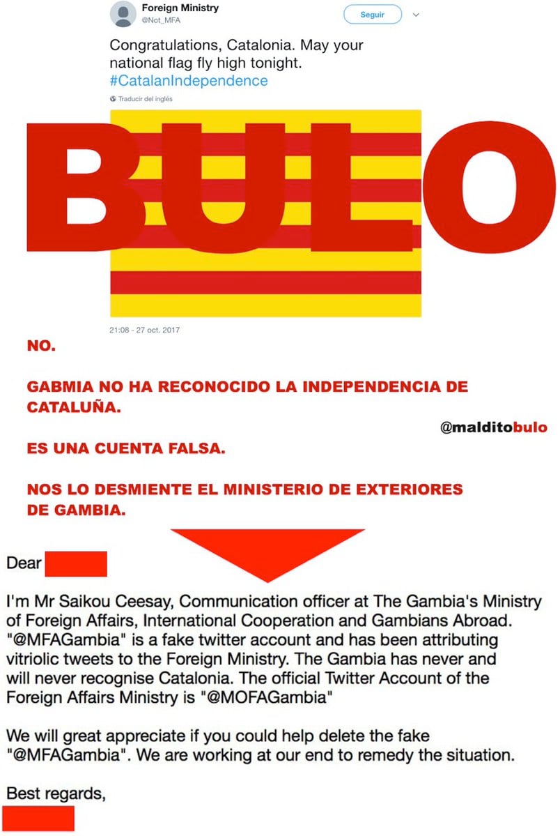 No, Gambia no ha reconocido la independencia de Cataluña. Es una cuenta falsa, confirmado por el Ministerio de Exteriores de Gambia.