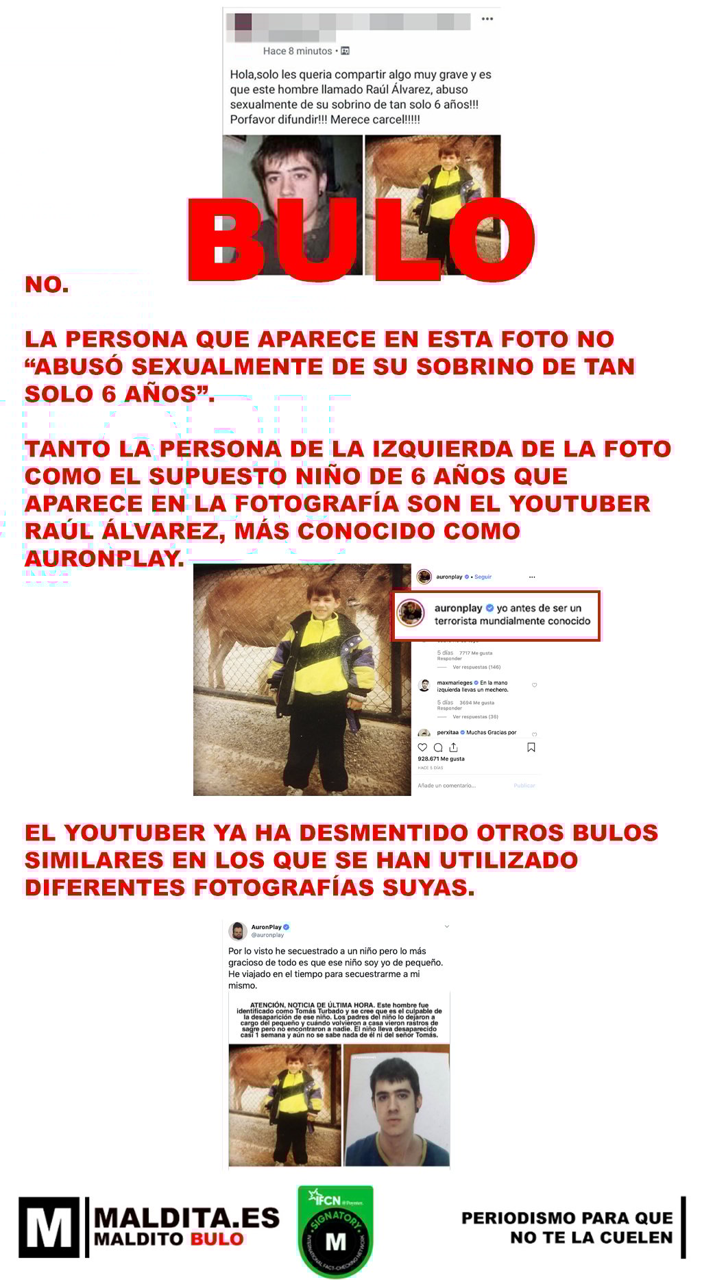 - Tanto la persona de la izquierda de la foto como el supuesto niño de 6 años que aparece en la fotografía son el youtuber Raúl Álvarez, más conocido como Auronplay.