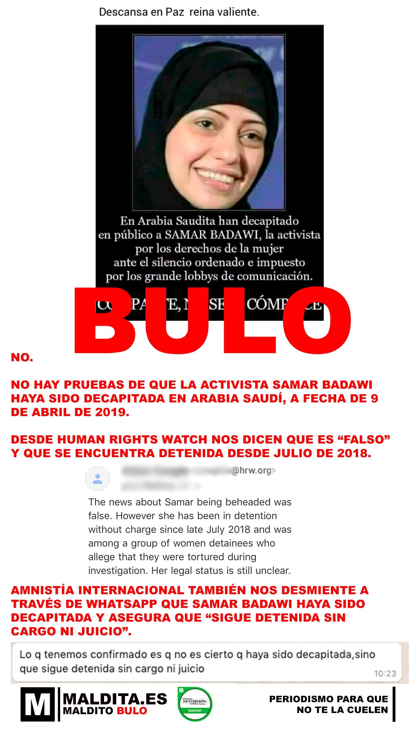 - Amnistía Internacional también nos desmiente a través de WhatsApp que Samar Badawi haya sido decapitada y asegura que "sigue detenida sin cargo ni juicio".