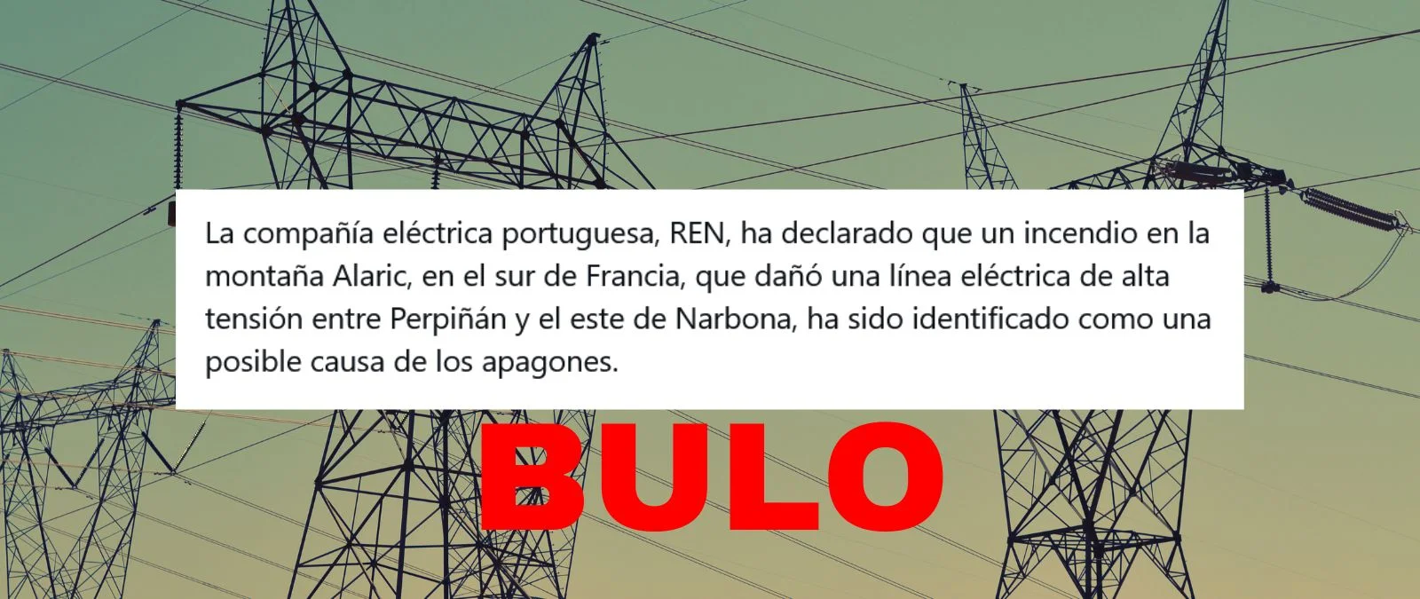Algunos contenidos aseguran que el apagón fue por un incendio entre Narbona y Perpiñán (Francia) “que dañó una línea de alta tensión crucial”. Es un bulo. El operador francés de la red eléctrica de alta tensión, RTE, ha asegurado que “no se ha reportado ningún incendio entre Narbona y Perpiñán” y lo cataloga de “información falsa” Redes Eléctricas Nacionais (REN), entidad encargada de suministrar electricidad y gas natural en Portugal, ha afirmado a Verificat que el incendio entre Perpiñán y Narbona es “una historia antigua”.