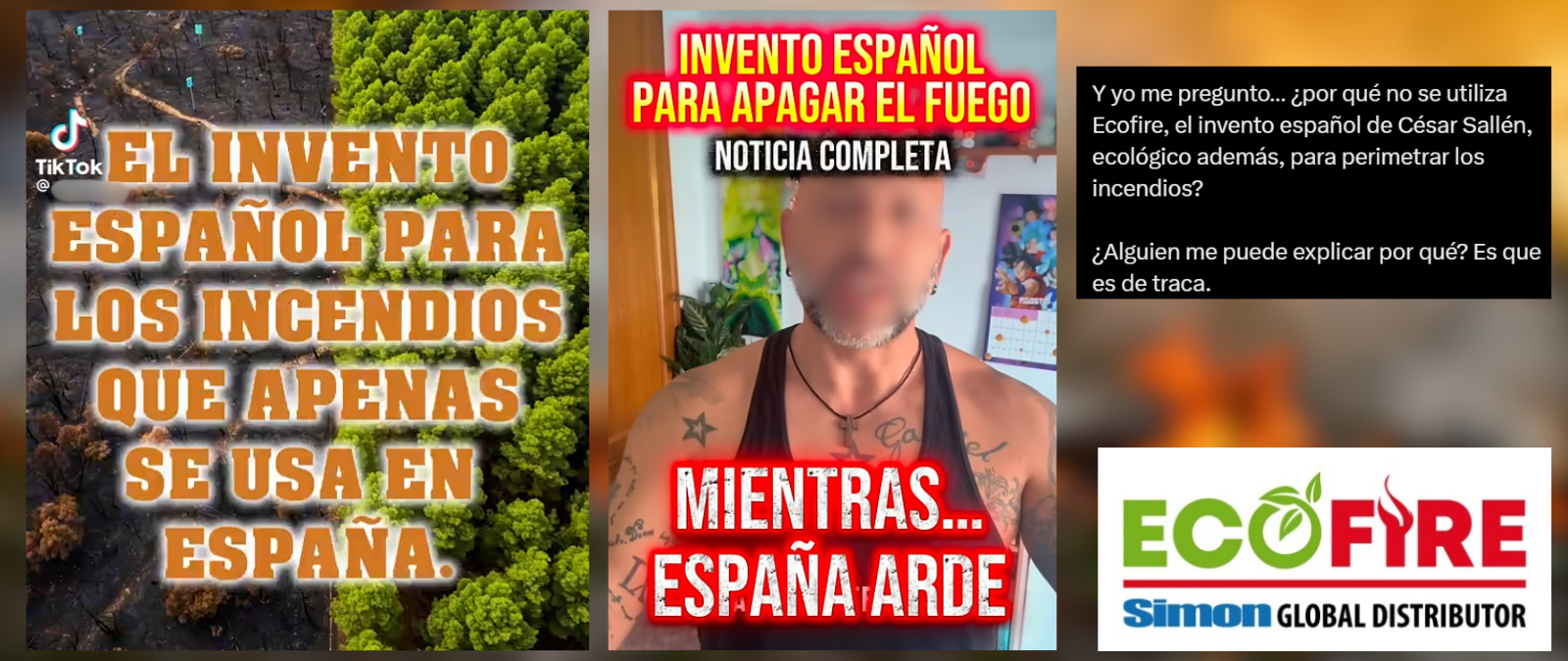 El producto del que se habla en esos contenidos se llama Ecofire, creado y patentado por César Sallén. Este invento se ha compartido en redes en el contexto de los incendios forestales de 2025 en la península ibérica, afirmando que podría “solucionar” los fuegos gracias a su alta efectividad, “40 veces superior a la del agua”. “Mientras medio país arde, este producto podría salvar miles de hectáreas y vidas”, dicen los contenidos.