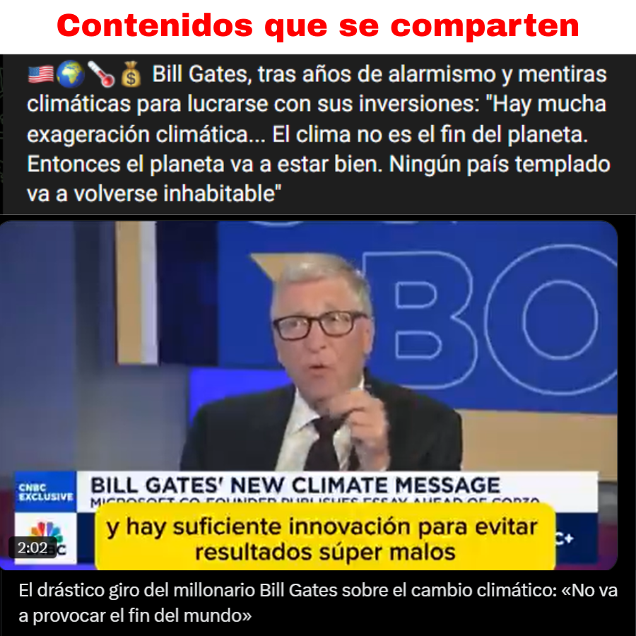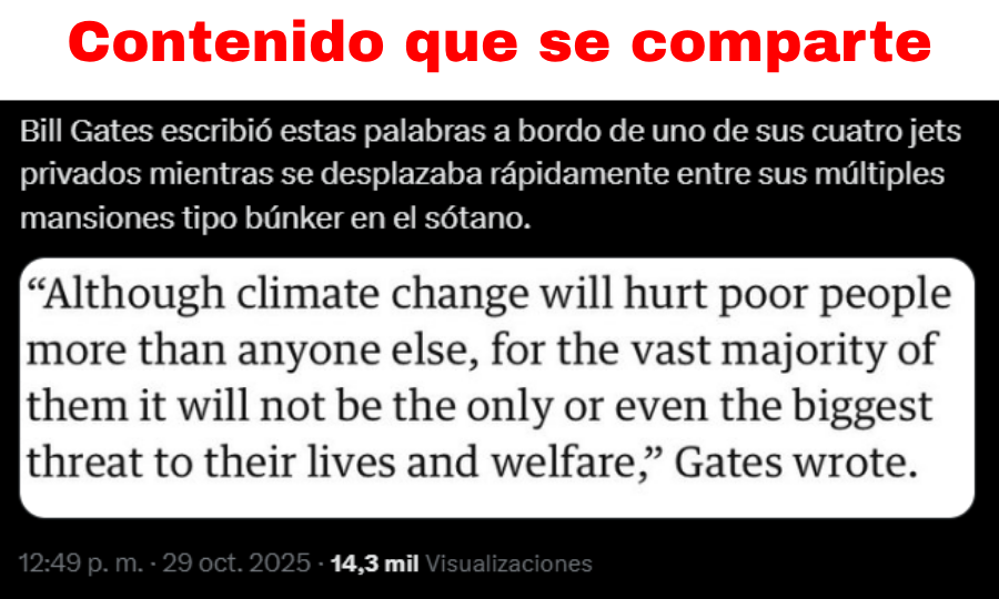Hay contenidos que dicen que, con su texto, “Gates reconoce haber engañado a todo el mundo con respecto al cambio climático” y que ha “rectificado” su postura. No aclaran con qué habría engañado Gates exactamente: ¿Su existencia? ¿Su gravedad? ¿Las formas de combatirlo?