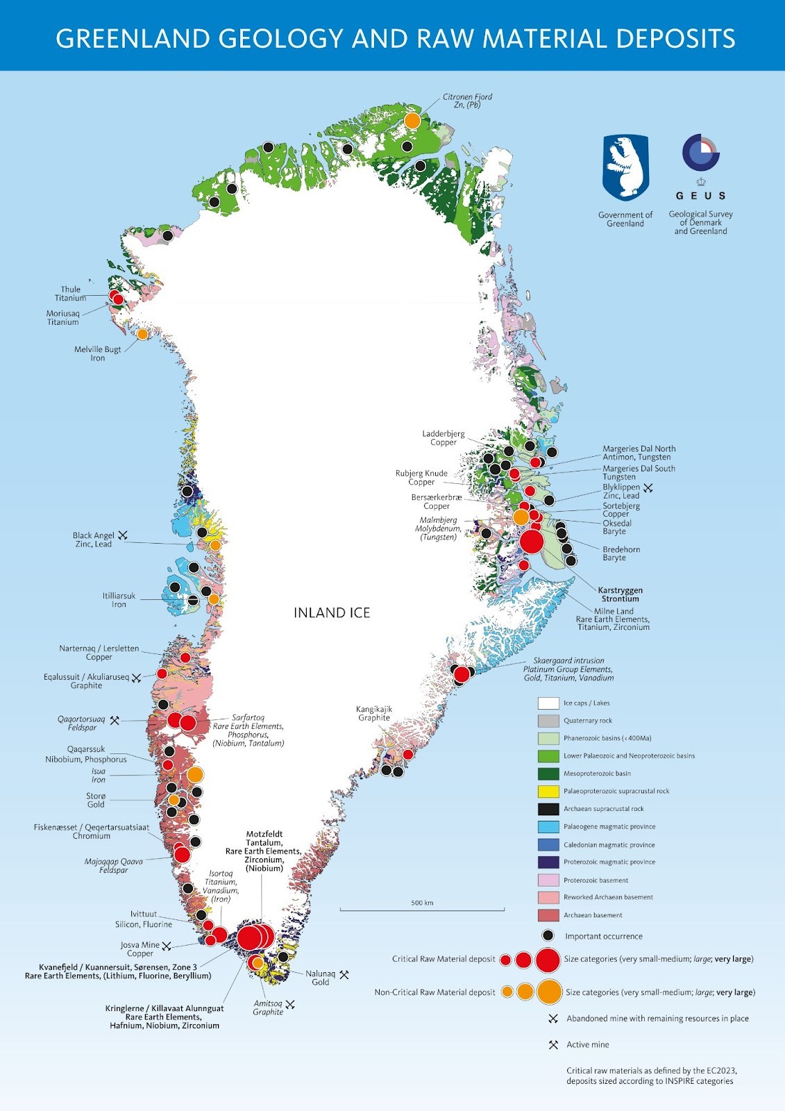 En 2023, un estudio del Servicio Geológico de Dinamarca (GEUS en sus siglas en inglés) señaló que Groenlandia tenía capacidad para suministrar 27 de las 34 “materias primas críticas” identificadas por la Comisión Europea. La lista de materias primas críticas para la Unión Europea son aquellas consideradas “cruciales para la economía europea” e incluye, entre otros muchos materiales, a casi todas las tierras raras. Ese estudio también señaló que en Groenlandia podrían encontrarse cromo, molibdeno, estaño y zirconio.