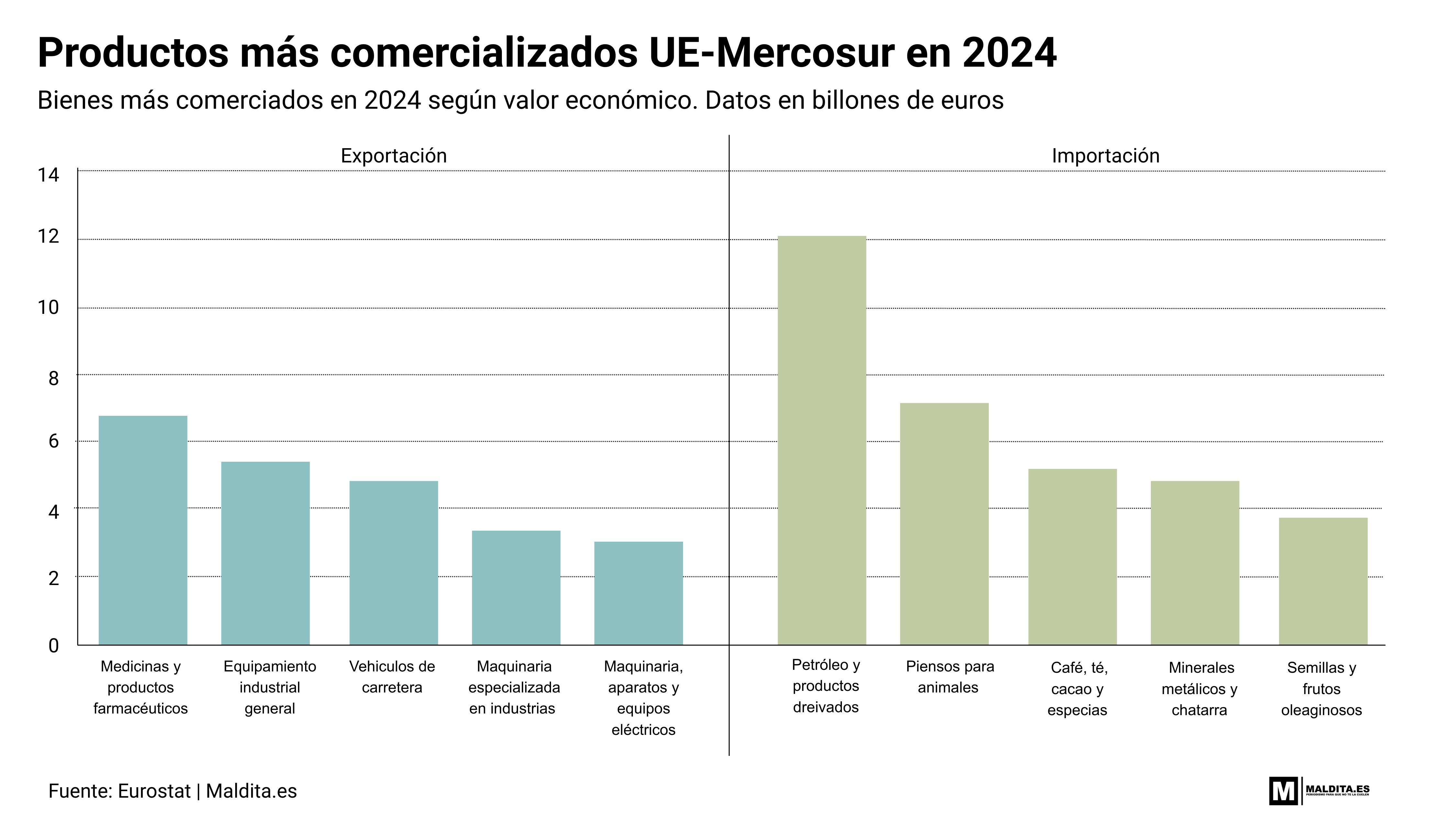 En términos generales, la relación comercial entre la Unión Europea y los países de Mercosur ha ido creciendo durante la última década. Entre 2014 y 2024, el comercio de bienes entre la UE y el Mercosur creció más de un 36%: las importaciones más del 50% y las exportaciones un 25%.
