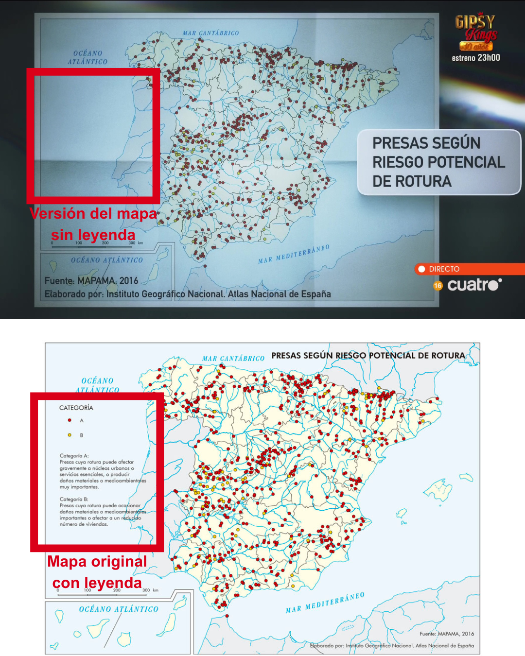“No se trata de una clasificación de las presas más inseguras, sino de establecer cuáles son las que más daño podrían causar en caso de fallo”, explica Rogelio Galván, ingeniero técnico de Obras Públicas y maldito que nos ha prestado sus superpoderes. El MITECO señala que esta clasificación se hace tras analizar los posibles daños “aguas abajo” de las presas y que no indica “el estado de seguridad o inseguridad en que esté la presa”. Además, para las presas “que se clasifican en los niveles de riesgo potencial más alto, se establecen mayores requisitos de seguridad, como la elaboración de planes de emergencia”, explica Galván.