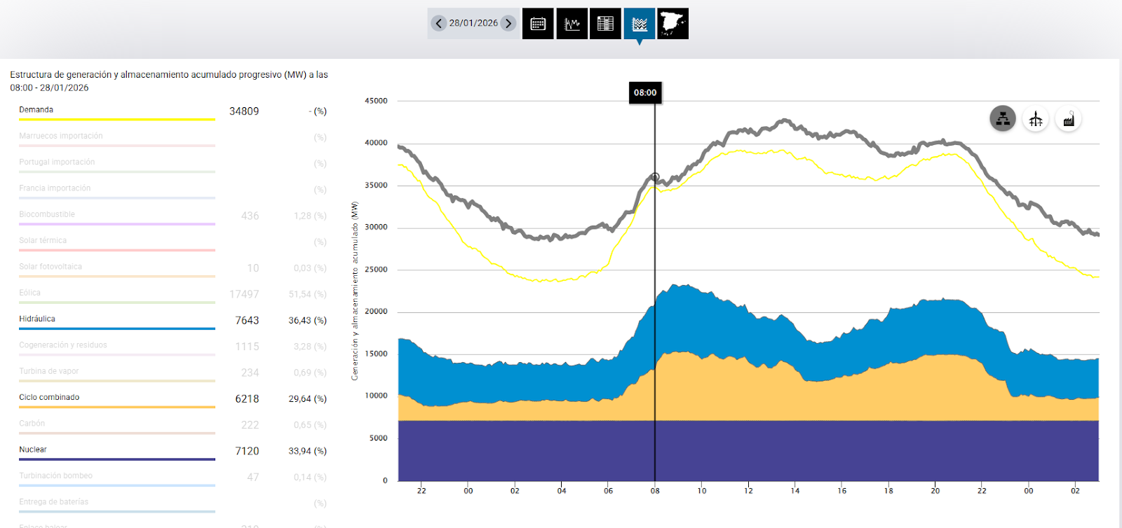 En cuanto al uso de otras fuentes de energía para cubrir la falta de producción que señalan los contenidos, entre las 8:00 h y las 9:10 h, la generación a través de ciclos combinados aumentó un 32%, mientras que los embalses hidroeléctricos generaron cerca de un 3% más. La producción de energía nuclear se mantuvo estable durante toda la jornada, a diferencia de lo que afirman algunos contenidos. “Tanto las importaciones, como la eólica, como cualquier otra fuente de energía conectada a la red, sube y baja continuamente”, pero “las bajadas se compensan con subidas en otras fuentes o con una bajada pactada en ciertos consumos, de modo que la red se mantiene estable”, explica Lucena.
