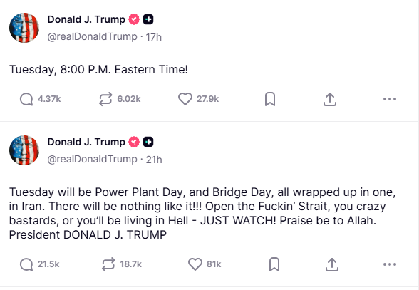 El 5 de abril, Trump publicó en Truth Social que el martes (7 de abril) sería “el día de las plantas energéticas y el día de los puentes” en Irán y pidió al régimen iraní, que calificó como “cabrones”, que abriera “el puto estrecho” [de Ormuz]. En otro post posterior, puso una fecha: “Martes a las 20:00h, de la costa Este de EEUU” (a las 3:30 de la madrugada del miércoles en Teherán).