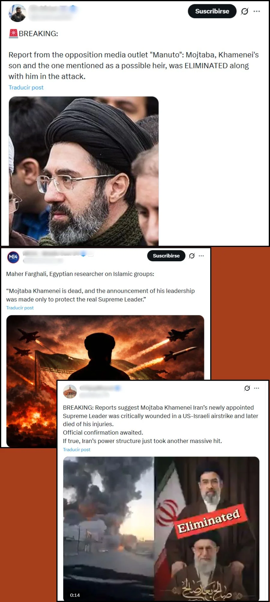 El 15 de marzo, Donald Trump dijo en una entrevista a NBC News sobre el líder iraní: “No sé si siquiera está vivo. Hasta ahora, nadie ha podido demostrarlo”. Mientras tanto, el 16 de marzo, diversos medios han publicado sobre un supuesto traslado secreto a Moscú de Mojtaba para ser operado por las heridas que tiene.