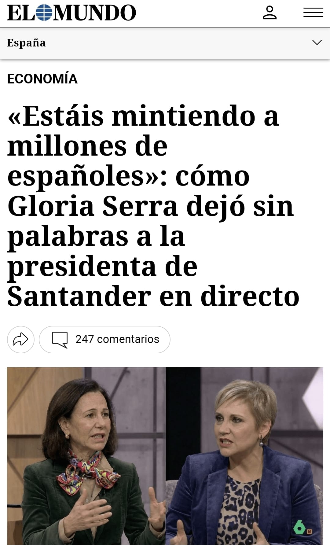 El enlace lleva a una página web que utiliza el nombre y el logo de El Mundo y asegura que Gloria Serra ha promocionado la supuesta plataforma de inversión Noble Capitenza. Sin embargo, no está autorizada por la Comisión Nacional del Mercado de Valores (CNMV) para prestar servicios de inversión y la URL de la web (elmundo-temas.today) no tiene relación con la página oficial de El Mundo (elmundo.es). Tampoco hay rastro de que Ana Botín y Gloria Serra hayan coincidido en La Sexta, como se muestra en la imagen que acompaña el artículo. El enlace no está disponible a 17 de marzo.
