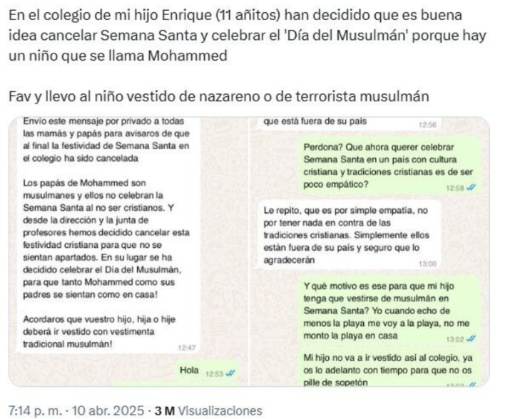 Cuidado con el supuesto mensaje de un colegio avisando de la sustitución de la Semana Santa por el "Día del Musulmán": ya circuló la misma supuesta conversación en 2025