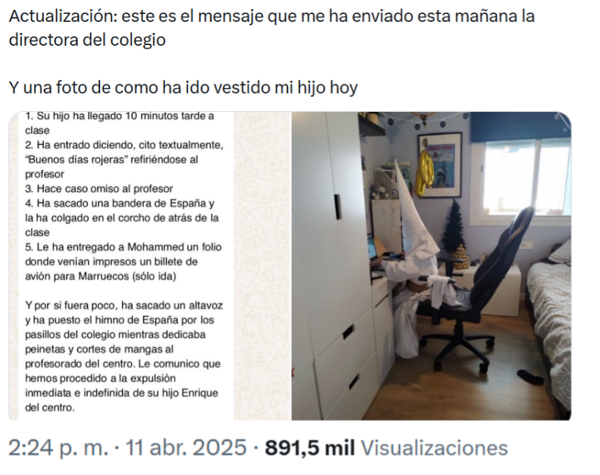 La conversación de WhatsApp difundida en marzo de 2026 como actual sobre la supuesta sustitución en un colegio de la Semana Santa por el “Día del Musulmán” ya circuló en abril de 2025, en ambos casos sin especificar a qué centro se refieren ni aportar pruebas que respalden su veracidad. Además, en 2025, el mismo usuario que publicó las imágenes de la supuesta conversación, continuó la historia afirmando que se había opuesto a la exigencia del colegio y que había decidido mandar a su hijo vestido de nazareno a clase. Sin embargo, la imagen que publicó ya circulaba en Internet en 2024.