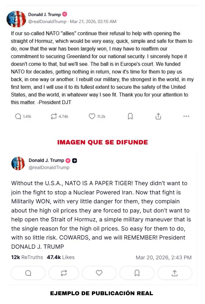Las publicaciones más recientes del presidente estadounidense que incluyen mensajes sobre los ataques de EEUU, Israel e Irán hacen alusiones a Irán, a los miembros de la OTAN o al estrecho de Ormuz, pero Groenlandia no aparece mencionada. “Si Irán no abre completamente [...] el estrecho de Ormuz [...] Estados Unidos atacará y aniquilará sus diversas centrales eléctricas", publicó el 22 de marzo. Donald Trump menciona en otros posts del 20 de marzo el estrecho de Ormuz: “El estrecho de Ormuz deberá ser custodiado y vigilado”, así como críticas a la OTAN: “¡Sin EE. UU., la OTAN es un tigre de papel! No quisieron unirse a la lucha para detener a un Irán con armas nucleares”, porque “no quieren ayudar a abrir el Estrecho de Ormuz”. Una publicación del 17 de marzo también incluye mensajes en contra de la OTAN: “Siempre he considerado que la OTAN [...] es una relación unilateral: nosotros los protegemos, pero ellos no hacen nada por nosotros”. En ninguno de estos mensajes habla de “proteger Groenlandia”.