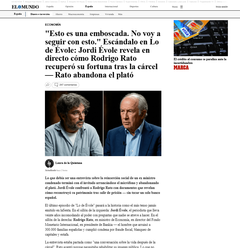 El enlace conduce a una web que utiliza el nombre y el logo de El Mundo y asegura que Jordi Évole “revela en directo cómo Rodrigo Rato recuperó su fortuna tras la cárcel”. La URL de la web (enclave [.] elmundode [.] click) no coincide con la página oficial de El Mundo (elmundo.es/) y a 1 de abril de 2026 la web sigue disponible. Además, incluye imágenes y una transcripción de la supuesta entrevista realizada por Évole al ex ministro de Economía y Hacienda, pero no hay constancia de que haya sucedido en "Lo de Évole", un programa real de La Sexta.