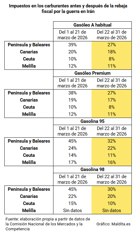 Los combustibles usados para repostar están gravados por dos impuestos. El primero es el impuesto sobre hidrocarburos, una tarifa fija que se paga por cada litro de combustible sumándose a su precio inicial. Cada combustible tiene su tarifa y la mayoría de ellas se han reducido con la reforma del 22 de marzo. En segundo lugar, a la suma del precio inicial más el impuesto de hidrocarburos se aplica el IVA o impuesto sobre el valor añadido, que ha pasado del 21 al 10%.