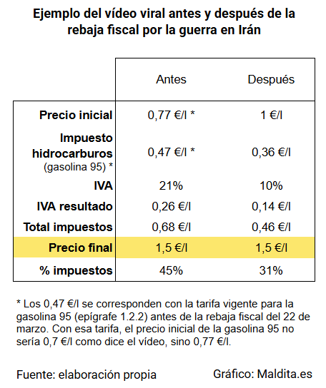 El aumento continuo de los precios tras los ataques de EEUU e Israel a Irán y la rebaja de los tipos impositivos hacen que ese porcentaje de impuestos se haya reducido. Siguiendo el ejemplo del vídeo viral, pero aplicando la nueva fiscalidad, de cada 1,5 € el litro de gasolina, la gasolinera se lleva 1 € y el Estado recauda 0,5 €, es decir, un tercio del dinero, como se ve en la tabla inferior.
