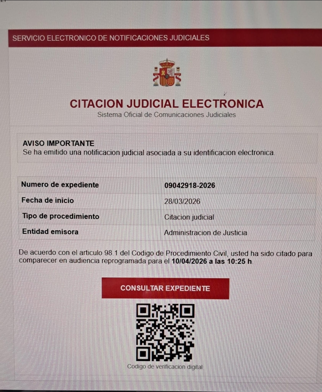 SERVICIO ELECTRONICO DE NOTIFICACIONES JUDICIALES CITACION JUDICIAL ELECTRONICA Sistema Oficial de Comunicaciones Judiciales AVISO IMPORTANTE Se ha emitido una notificacion judicial asociada a su identificacion electronica. Numero de expediente Fecha de inicio Tipo de procedimiento Entidad emisora 09042918-2026 28/03/2026 Citacion judicial Administracion de Justicia De acuerdo con el articulo 98.1 del Codigo de Procedimiento Civil, usted ha sido citado para comparecer en audiencia reprogramada para el 10/04/2026 a las 10:25 h. CONSULTAR EXPEDIENTE Codigo de verificacion digital