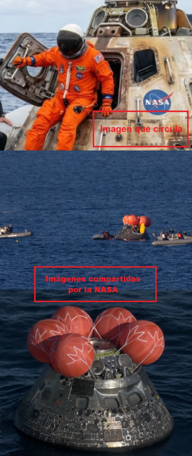 Además, en la superficie de la nave que aparece en la imagen que circula en redes sociales se ve una “pegatina” con el logo de la organización absolutamente intacto. Junto a esta imagen se han difundido comentarios que cuestionan que esta “pegatina” haya resistido altas temperaturas y elevadas velocidades “como si nada”. En la nave que aparece en las imágenes de la NASA no se aprecia ninguna pegatina. Otra diferencia es que en las imágenes oficiales de Artemis II de la NASA aparece la nave en el mar, una vez amerizada, con cuatro globos naranjas sobre ella, algo que no sale en la difundida en redes. También, el traje del astronauta es distinto: son diferentes los parches y el que lleva el de la imagen difundida tiene una especie de cremallera blanca en la parte central que no posee el que llevaban los astronautas de Artemis II, y los astronautas salieron sin las escafandras de la cápsula.