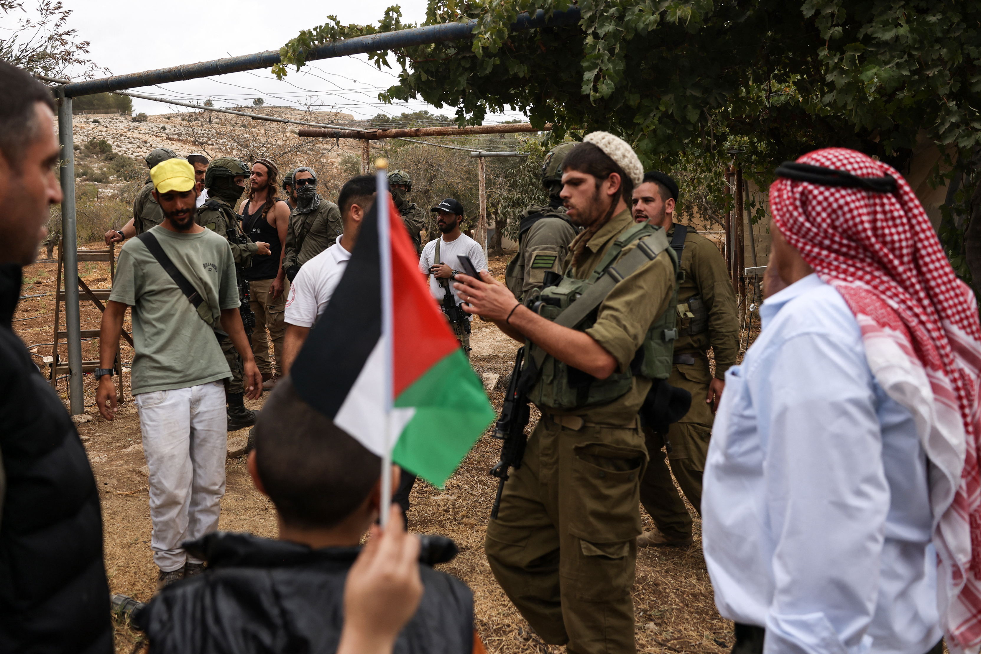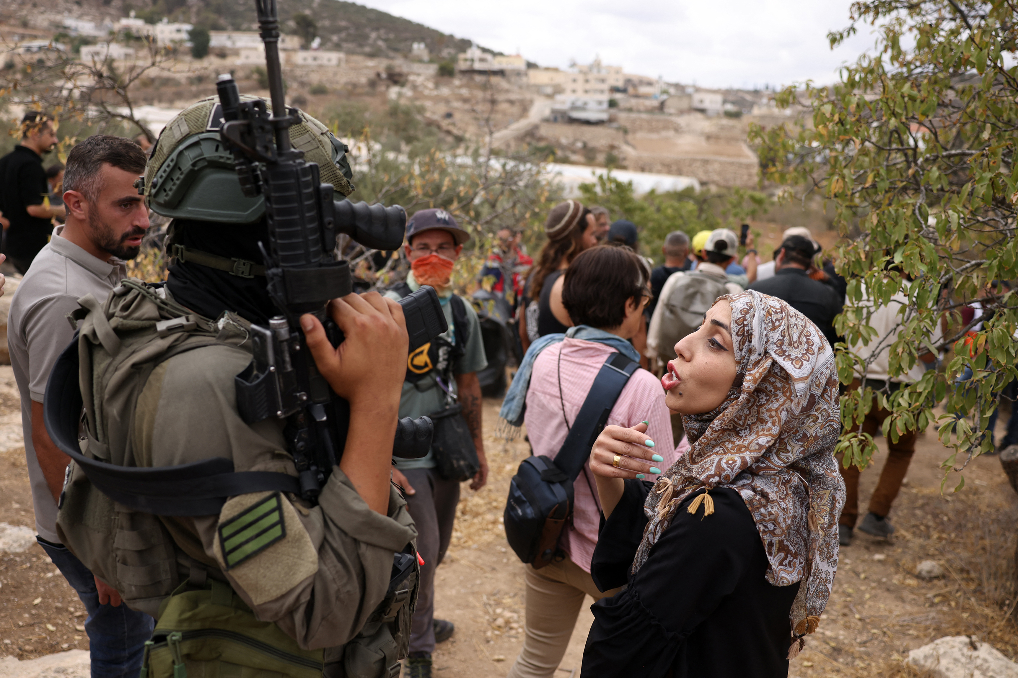 Soldados y colonos israelíes se congregan ante la mirada de aldeanos palestinos en la aldea de Edna, al norte de Hebrón, durante la temporada de cosecha de aceitunas, el 12 de octubre de 2025. (Foto de HAZEM BADER / AFP)Una mujer palestina habla con un soldado israelí en la aldea de Edna, al norte de Hebrón, durante la temporada de cosecha de aceitunas, el 12 de octubre de 2025. (Foto de HAZEM BADER / AFP)