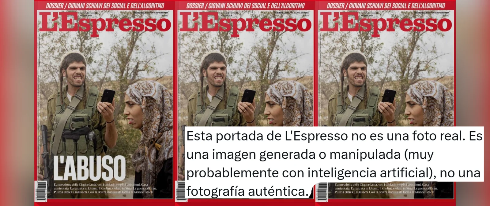 La imagen que aparece en la portada de la revista italiana L'Espresso del 10 de abril de 2026 de un colono israelí armado y sacando una foto a una mujer palestina está creada con IA