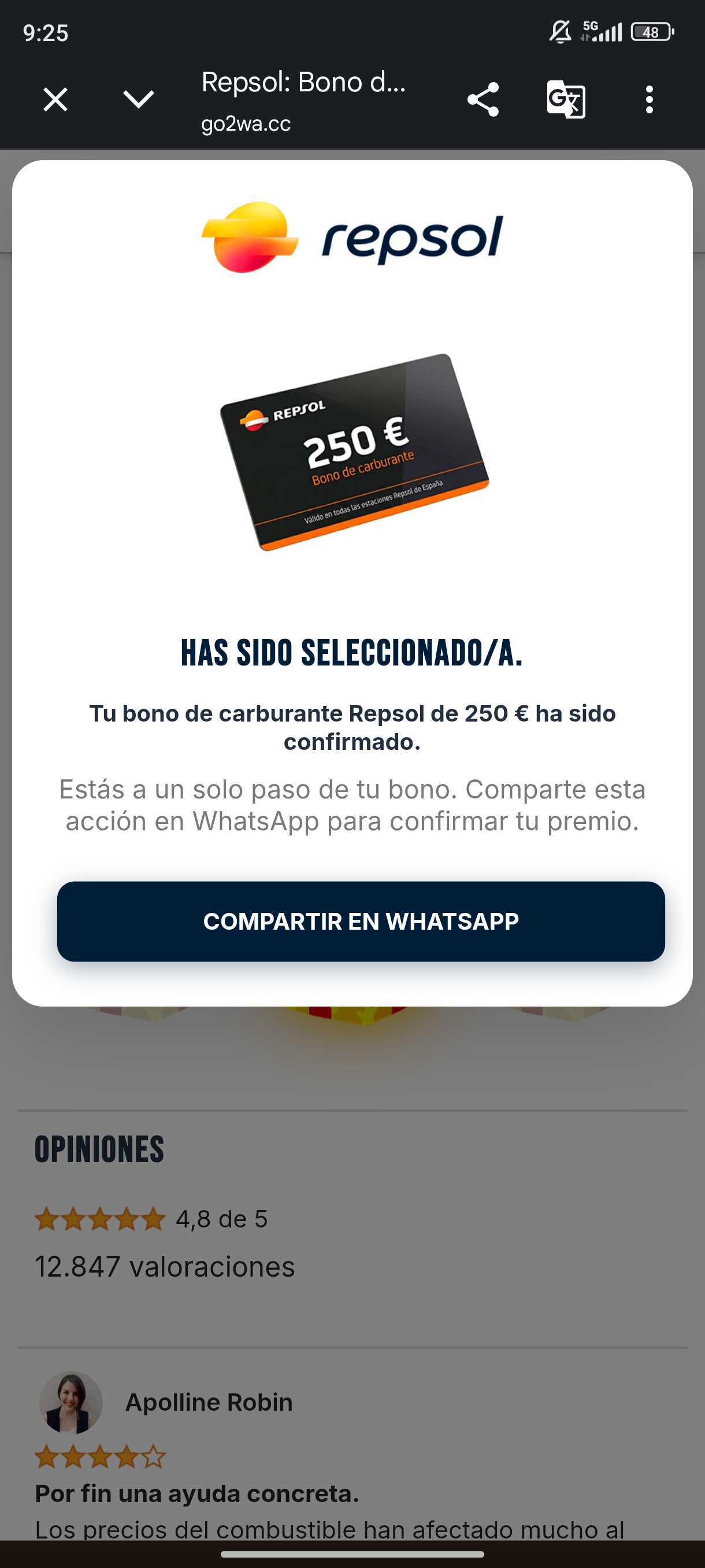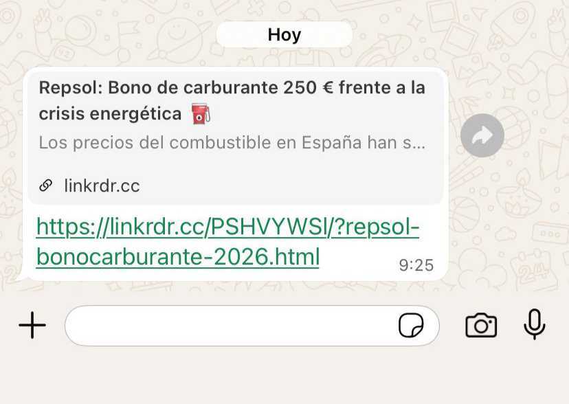 El enlace circula por WhatsApp y redirige a una web donde se asegura que Repsol está repartiendo bonos de 250 euros entre los conductores afectados por los precios del combustible. Pero el link lleva a una web fraudulenta (go2wa [.] cc) que suplanta a Repsol y que no está relacionada con la página oficial de la empresa de carburantes (https://www.repsol.com). La página fraudulenta invita a responder a una encuesta para poder conseguir el supuesto bono de carburante y después pide elegir entre cajas de regalo para encontrarlo, que siempre está en la segunda opción.