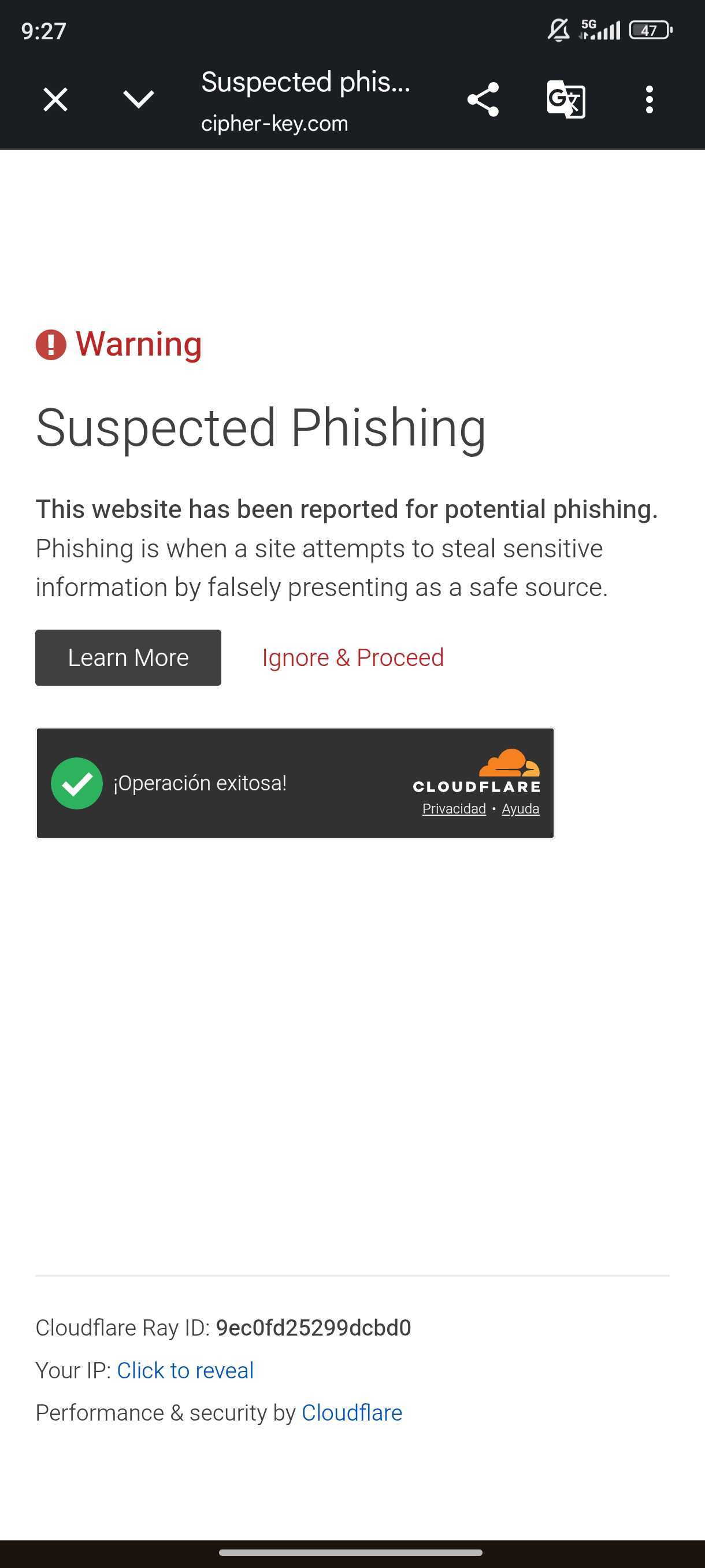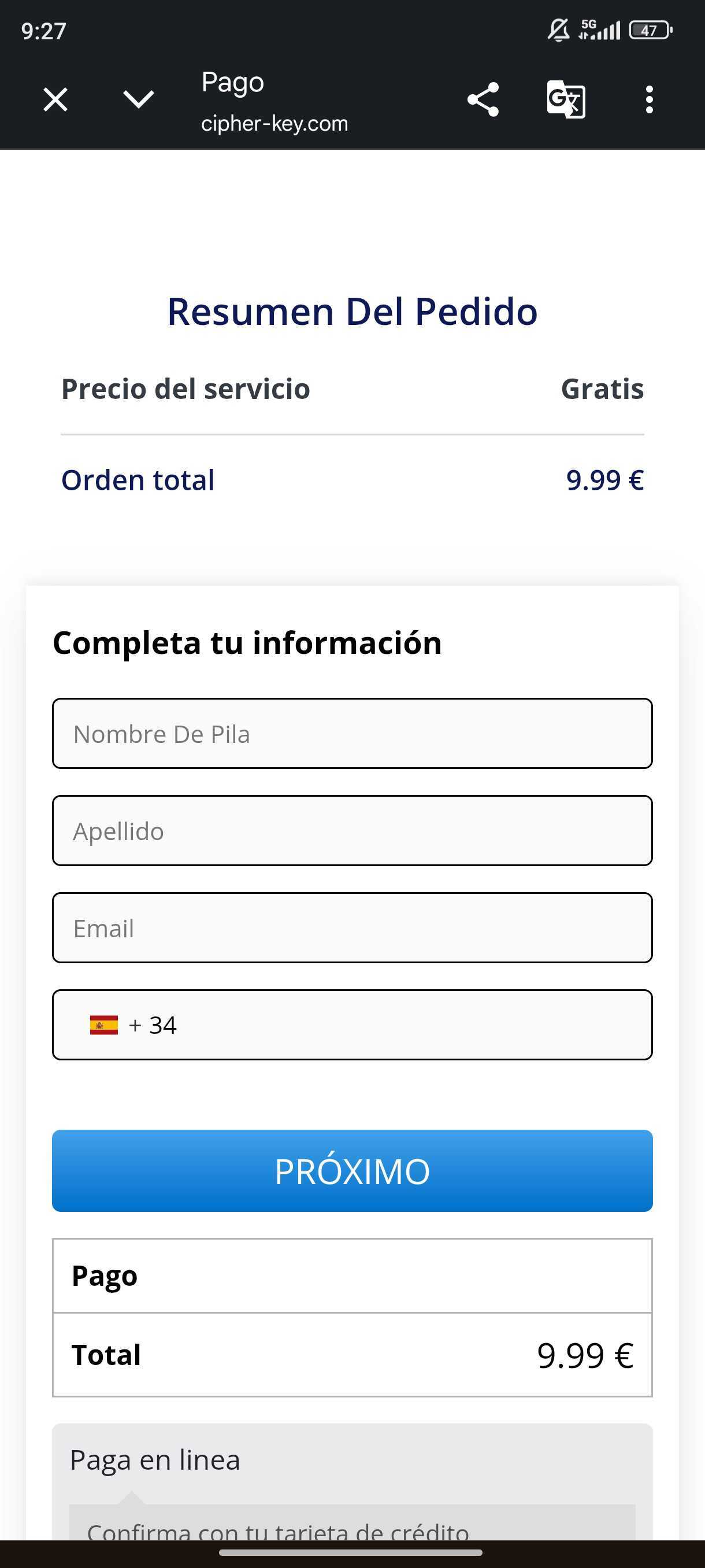 Para poder continuar con el proceso, la web pide compartir la acción en WhatsApp, una técnica habitual de los ciberdelincuentes para dar difusión al timo. Después de este paso, aparece un aviso que alerta de que la web a la que se está a punto de acceder es un posible phishing. Pero si ignoramos esta advertencia, la página redirige a un formulario que pide completar con datos personales para, finalmente, proceder al pago de 9,99 euros. Cuidado porque podrían darte de alta en un servicio online de pago que desconoces y hacer cargos en tu cuenta sin tu conocimiento.