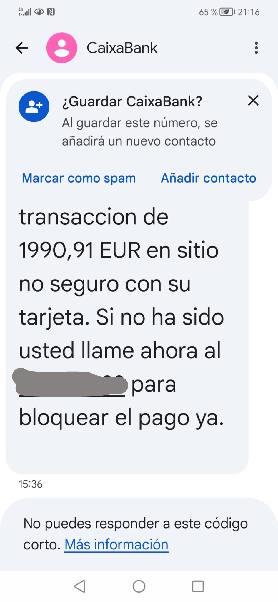 «SMS de Caixabank: detectada una transacción de 1990,91 euros en un sitio no seguro con su tarjeta»