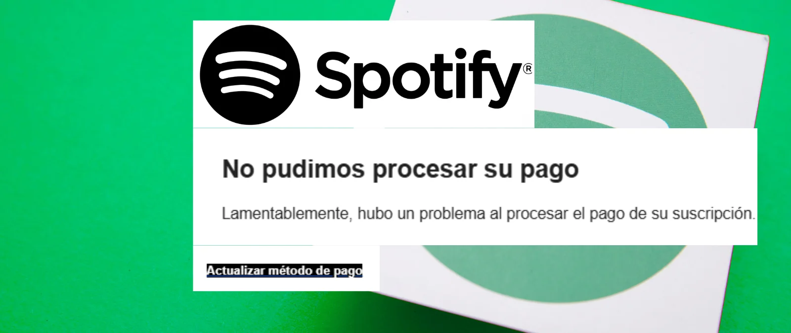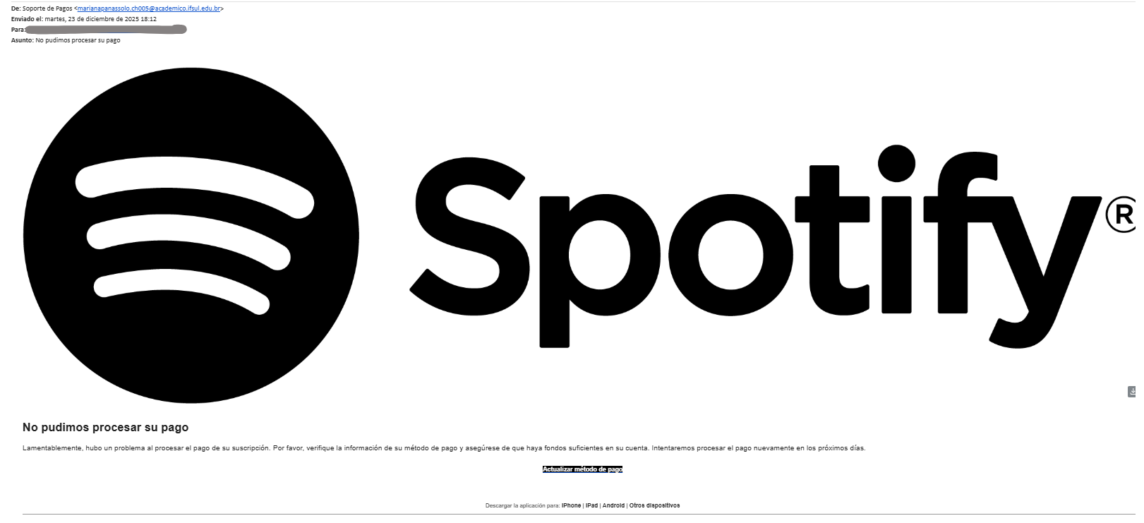 «Spotify alerta por correo electrónico de un problema con el pago a la suscripción y pide verificar la información de pago por saldo insuficiente»