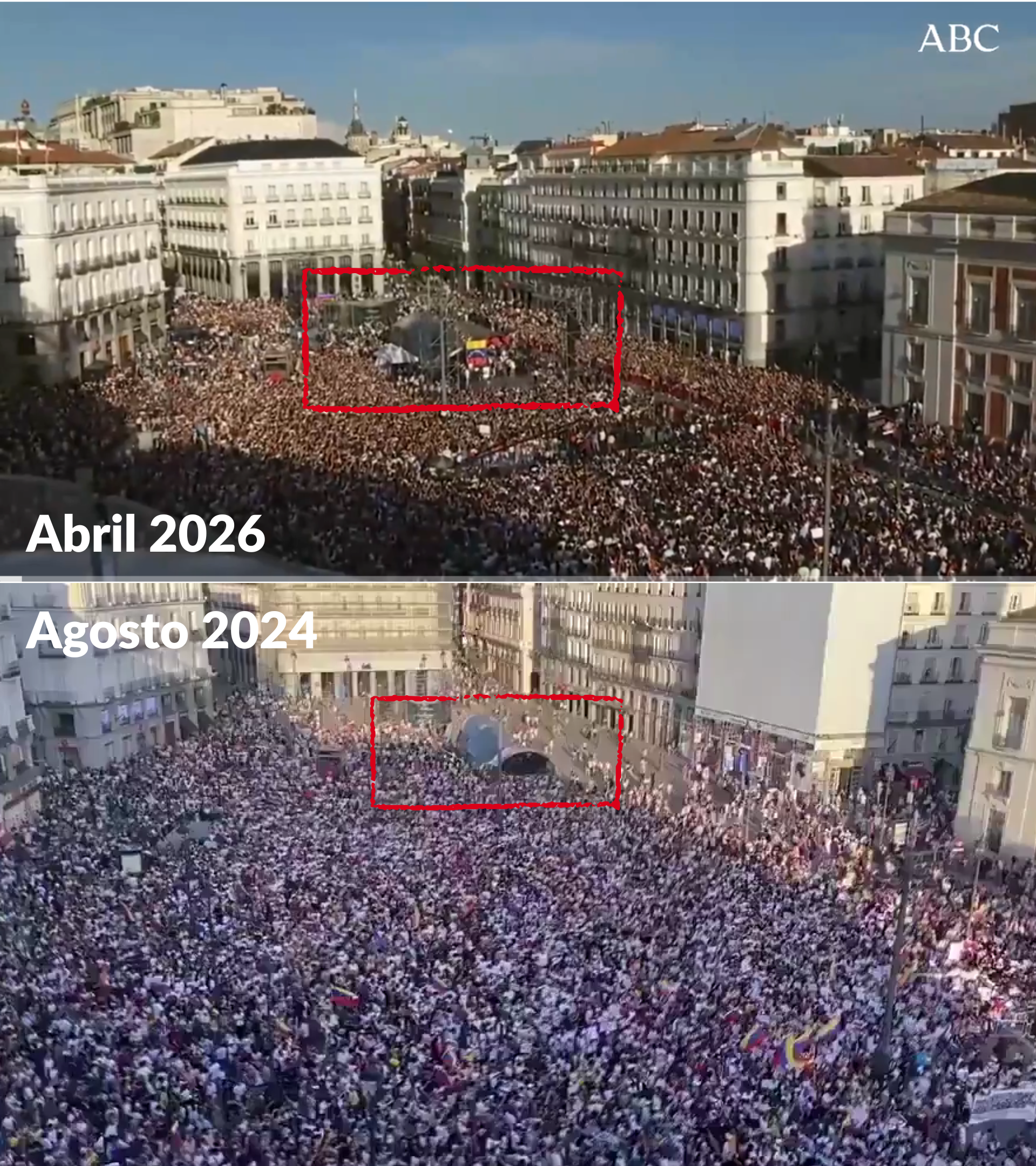 Este vídeo no es de la concentración en 2026 por la visita de María Corina Machado a Madrid para recibir la Medalla de Oro de esta comunidad. Se publicó en Twitter (ahora X) por primera vez el 17 de agosto de 2024, cuando hubo concentraciones en España en oposición a Nicolás Maduro tras las elecciones de Venezuela. Estas imágenes se grabaron en la Puerta del Sol (Madrid), donde acudieron 15.000 personas, según datos facilitados por la Delegación del Gobierno a EFE.
