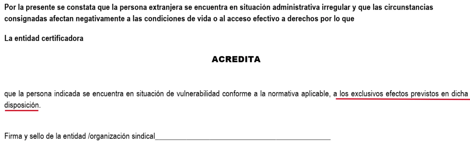 Entre las circunstancias de vulnerabilidad reconocidas en el certificado se encuentran el aislamiento social o la falta de una red de apoyo, estar en situación de sinhogarismo, carecer de ingresos suficientes, tener menores o personas dependientes a cargo o estar expuesto a situaciones de explotación o abuso, entre otras. Las entidades competentes para ratificar esta situación de vulnerabilidad son, según detalla la web del Ministerio, “los servicios sociales públicos, además de las entidades sociales y sindicatos inscritos en el Registro Electrónico de Colaboradores de Extranjería”.