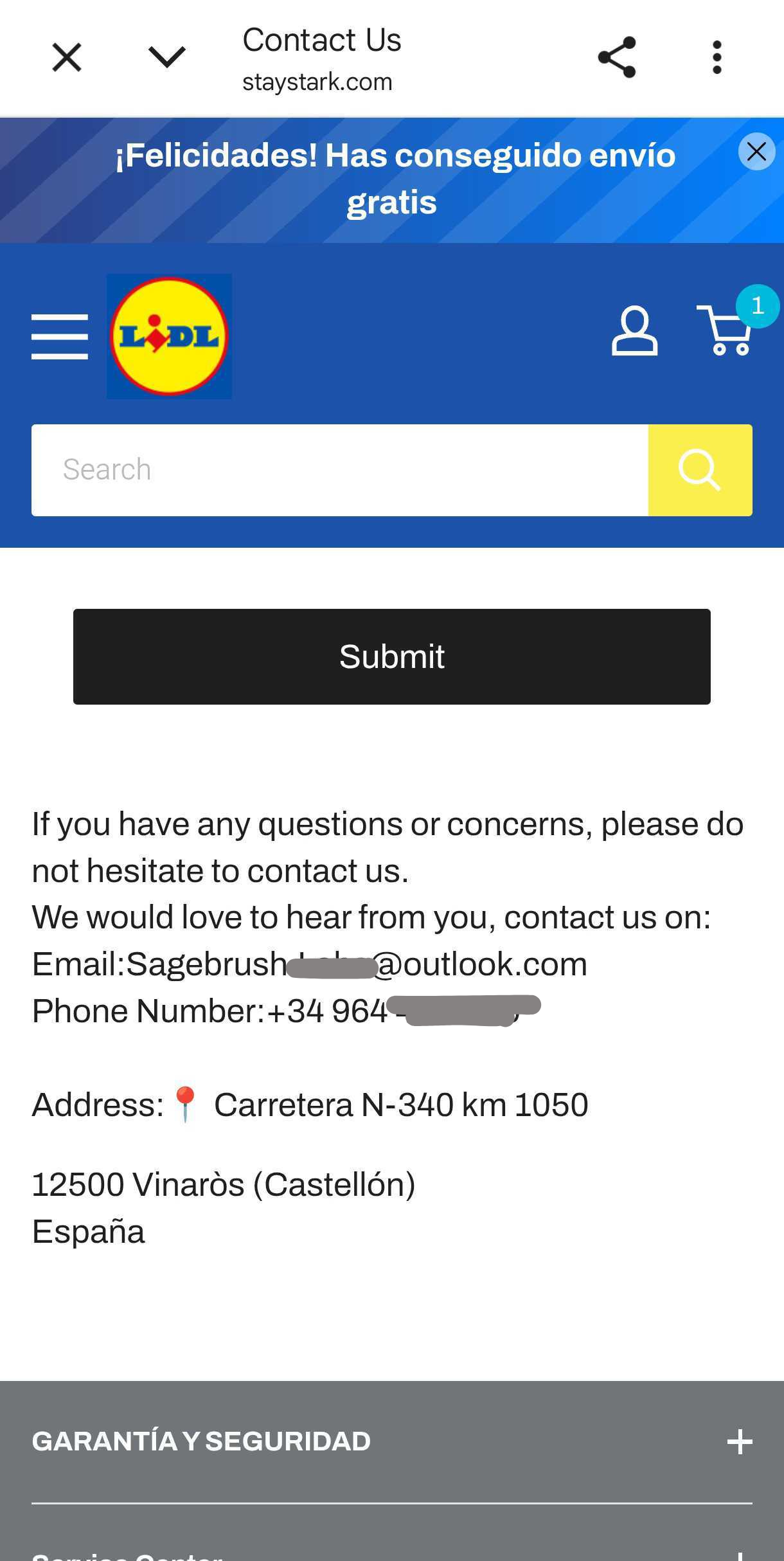 La web incluye la “política de devolución” y las “condiciones legales” que conducen a la supuesta información de servicio. Pero, al leer su contenido, ni el teléfono de contacto (964…) corresponde con el número oficial de atención al cliente de Lidl (900 958 311), ni el correo electrónico ofrecido (Sagebrush…@outlook.com) tiene el dominio oficial de la empresa. Aunque la web incluye estas secciones, carece del ‘aviso legal’ y de la ‘política de cookies’, que son apartados obligatorios para que una página web pueda operar de manera legítima en España. Además, para ganar la confianza del comprador, la página sospechosa también utiliza “el sello de confianza online”, un reconocimiento que se les concede a los comercios electrónicos seguros por cumplir una serie de requisitos. En este caso, al hacer click en el sello, no redirige a ninguna parte. En Maldita.es hemos identificado hasta 27 webs falsas que suplantaban a Lidl para engañar a los usuarios.