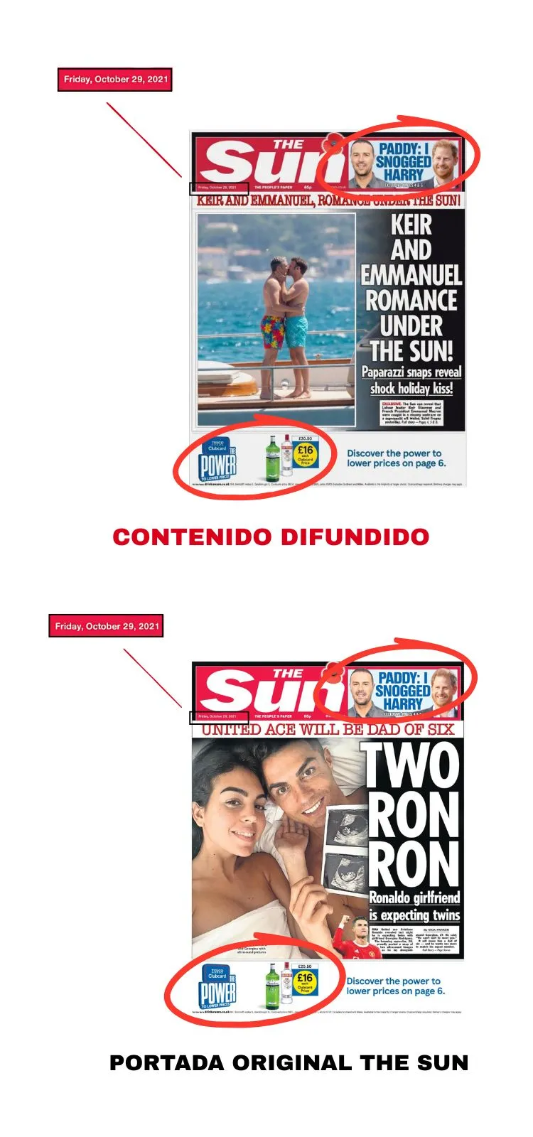 La portada original de ‘The Sun’ del 29 de octubre de 2021 —fecha a la que se atribuye la imagen difundida— no incluía esa fotografía. En su lugar, abría con una imagen del futbolista Cristiano Ronaldo y su pareja, Georgina Rodríguez, anunciando que esperaban gemelos.
