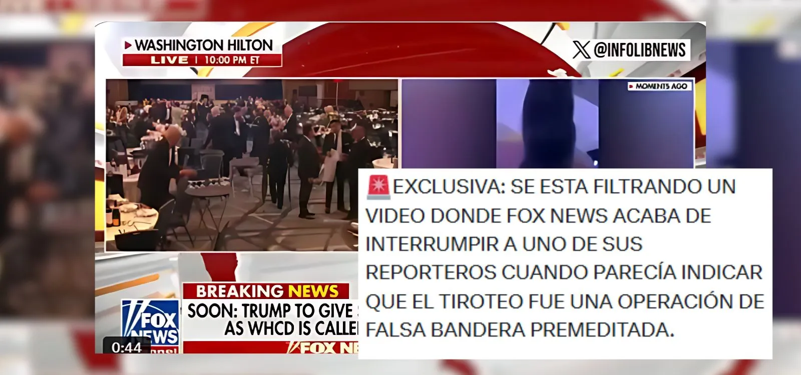 Circula un vídeo de una intervención de la corresponsal de Fox News en la Casa Blanca Aishah Hasnie el 26 de abril de 2026, tras el tiroteo en la Cena de Corresponsales de la Casa Blanca. En la intervención Hasnie cuenta que el marido de Karoline Leavitt, portavoz de la Casa Blanca, estaba sentado junto a ella y le dijo que tuviera “mucho cuidado”. La conexión se corta cuando Hasnie añade que él miró alrededor de la sala y dijo: “there are some…” (“hay algunos…”). Hay quien está utilizando en redes ese corte en la llamada de la corresponsal para decir que Fox silenciaba así a su reportera cuando iba a denunciar que el tiroteo había sido un ataque de falsa bandera o premeditado.