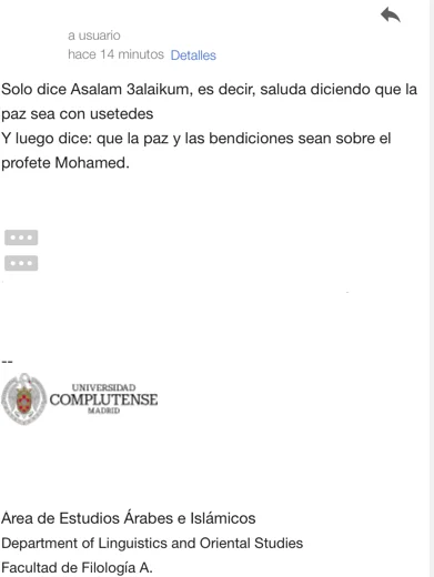 Captura del correo con la traducción de un profesor de Estudios Árabes de la Universidad Complutense de Madrid