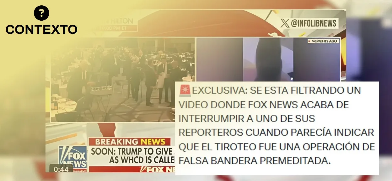 Circula un vídeo de una intervención de la corresponsal de Fox News en la Casa Blanca Aishah Hasnie el 26 de abril de 2026, tras el tiroteo en la Cena de Corresponsales. En la intervención Hasnie cuenta que el marido de Karoline Leavitt, portavoz de la Casa Blanca, estaba sentado junto a ella y le dijo que tuviera “mucho cuidado”. La conexión se corta cuando Hasnie añade que él miró alrededor de la sala y dijo: “there are some…” (“hay algunos…”). Hay quien está utilizando en redes ese corte en la llamada de la corresponsal para decir que Fox silenciaba así a su reportera cuando iba a denunciar que el tiroteo había sido un ataque de falsa bandera o premeditado.