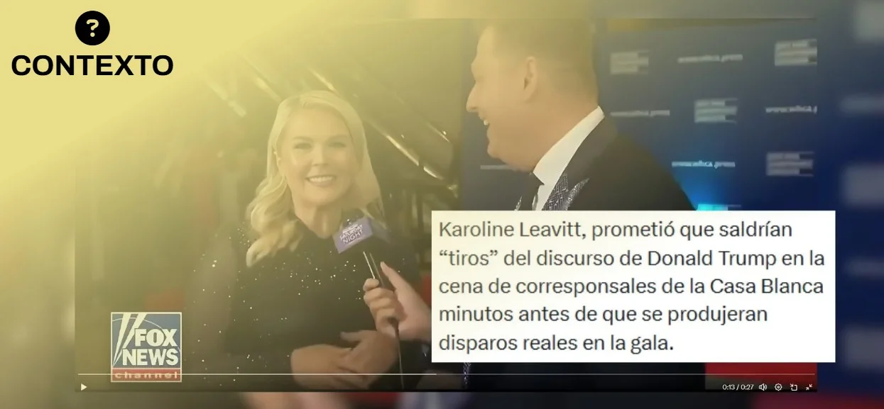 Varias publicaciones están difundiendo una frase de la portavoz de la Casa Blanca, Karoline Leavitt, como si hubiera sido una “premonición” del tiroteo ocurrido durante la cena de la Asociación de Corresponsales de la Casa Blanca el 26 de abril de 2026. En una entrevista previa con Fox News, Leavitt dijo que el discurso del presidente de Estados Unidos, Donald Trump, sería “divertido” y “entretenido” y que habría “algunos disparos en la habitación” (“some shots fired tonight in the room”). La expresión en inglés “shots fired” puede usarse en sentido literal, como “disparos”, pero también en sentido figurado, para mostrar “un desacuerdo o crítica” hacia alguien con un comentario directo. En este caso, Leavitt la pronunció en un contexto en el que hablaba del tono del discurso de Trump.
