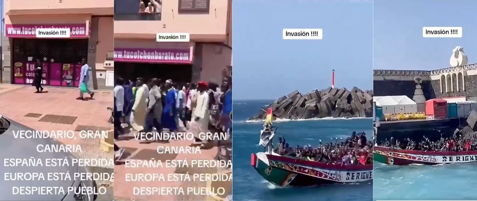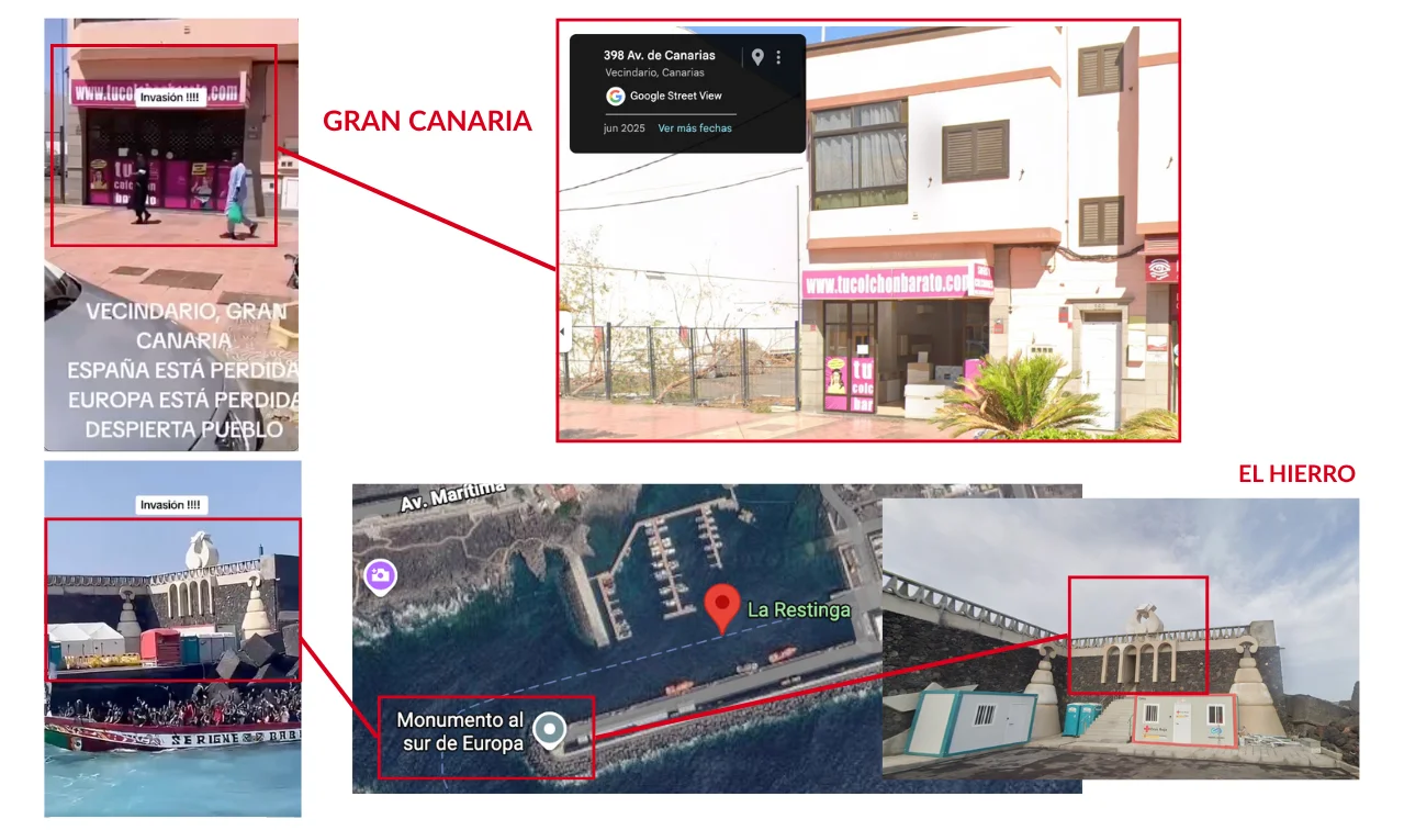 La primera parte del vídeo, que muestra a un grupo de personas migrantes paseando por una calle, está grabada en la ciudad de Vecindario, en el municipio de Santa Lucía de Tirajana (Gran Canaria). En Maldita.es hemos geolocalizado la grabación en la Avenida de Canarias, en torno al número 398 (27.842083535488456, -15.446812178085912). La segunda parte se corresponde con la llegada de una cayuco a la isla del Hierro, concretamente al puerto de La Restinga (27.638843209051874, -17.98143352979406). La escultura “Monumento al sur de Europa” permite constatar que las imágenes se graban en esta ubicación.