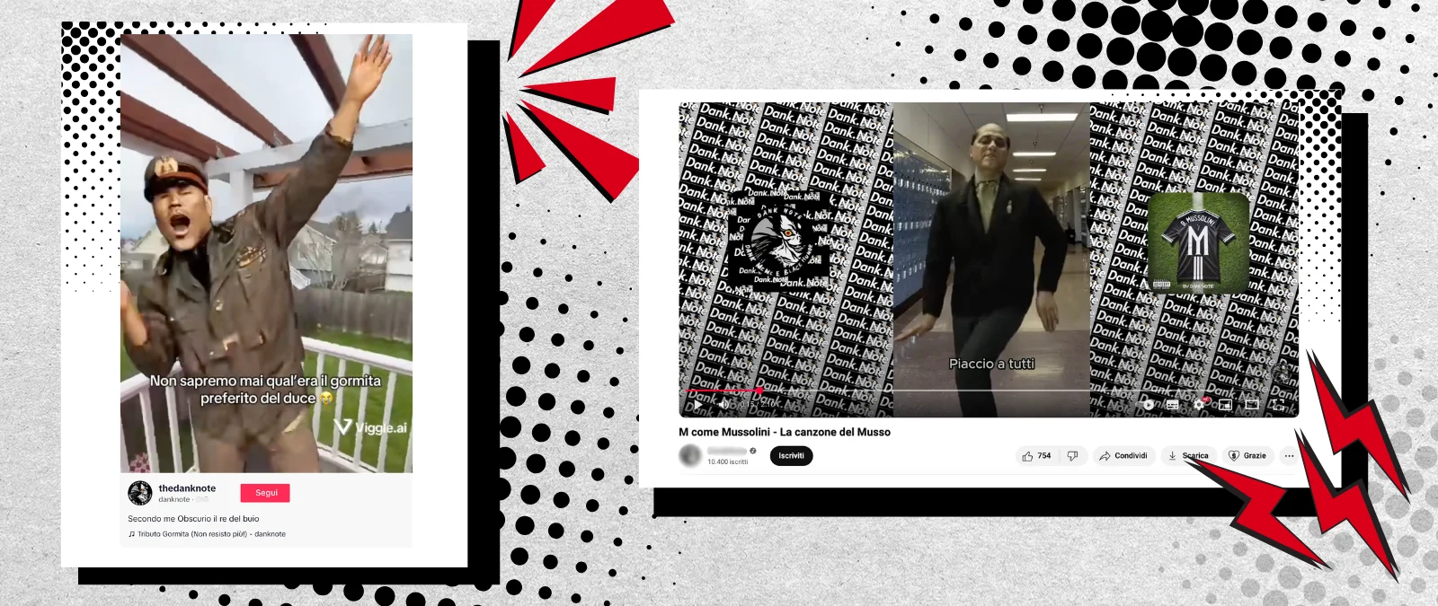 En Italia, canciones pop famosas como Someone Like You de Adele o temas que son tendencia en las redes sociales como Mine de Bazzi, acompañan fotos y vídeos de Mussolini —por ejemplo, mientras pronuncia discursos en la Piazza Venezia de Roma. Las imágenes aparecen con frases como “deseo nada más que lo mejor para ti, también”, propagando una imagen alterada, inofensiva e incluso deseable del Duce.