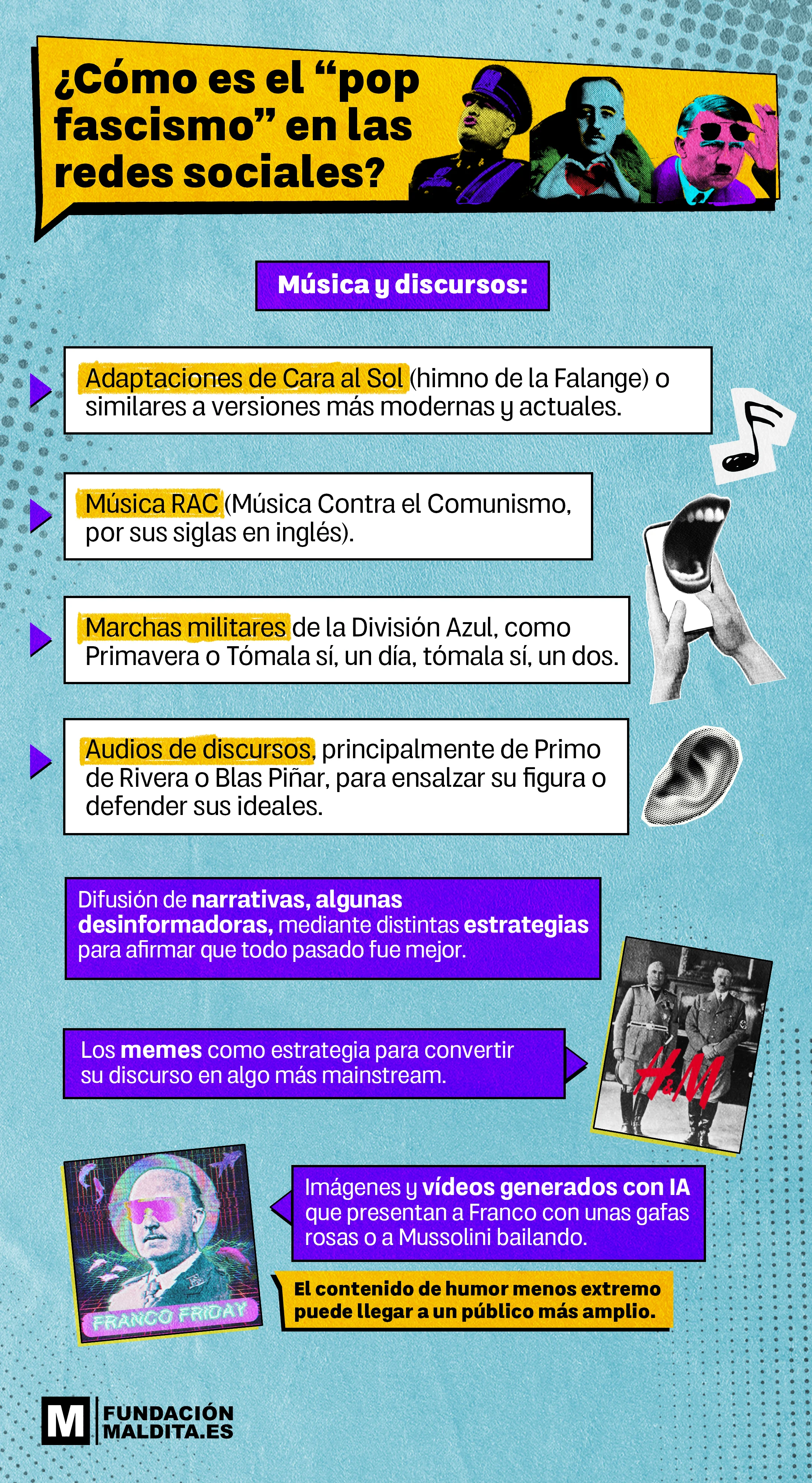 La celebración de los viernes de Franco (Franco Fridays) en Twitter (ahora X), los días del Führer o los sábados fascistas que implementó Mussolini en 1935 y los discursos de Blas Piñar y Primo de Rivera, que aparecen de fondo en vídeos de TikTok, contribuyen a su idolatrización. Y todos esos contenidos ya se han extendido por las redes sociales con diferentes grados de coordinación y comportamiento en función de cada plataforma. Es el ‘pop fascismo’ y se cuela en nuestro día a día mediante múltiples elementos de la cultura contemporánea.