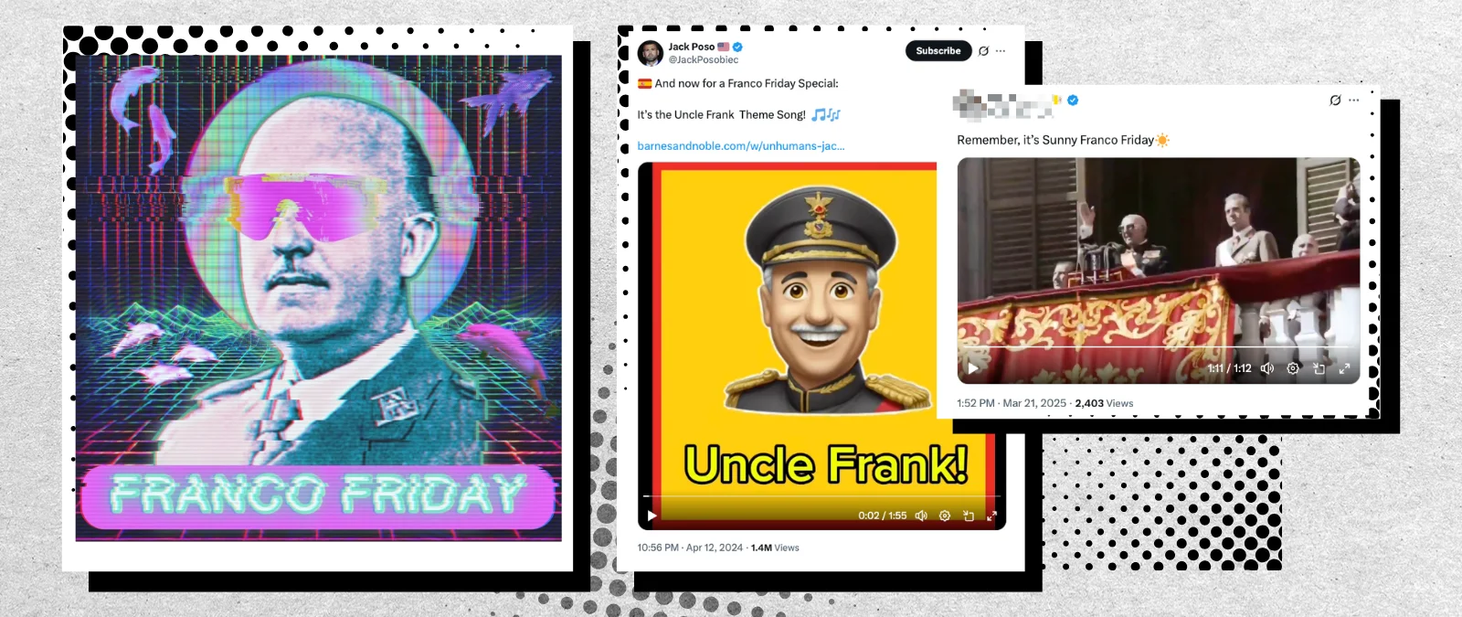 En paralelo, se da espacio también a los Franco Fridays, los Viernes de Franco, cuyo origen en redes sociales se desconoce (las primeras publicaciones que hemos localizado en X son de 2021). Jack Posobiec, que ya ha difundido teorías de la conspiración como el Pizzagate, también promueve los Franco Fridays en X de forma bastante activa. La primera mención a este término en su cuenta oficial es del 29 de diciembre de 2023. Desde entonces, ha publicado decenas de tuits haciendo referencia a los Franco Friday, todos con miles de visualizaciones. Incluso ha compartido una canción generada con inteligencia artificial llamada Uncle Frank (“Tío Franco” en su traducción literal al español), cuya letra incluye frases como “hace mucho tiempo, España estaba en problemas, pero entonces apareció un hombre llamado tío Franco. Era valiente y audaz” o “el tío Franco le dio una paliza a los rojos”.