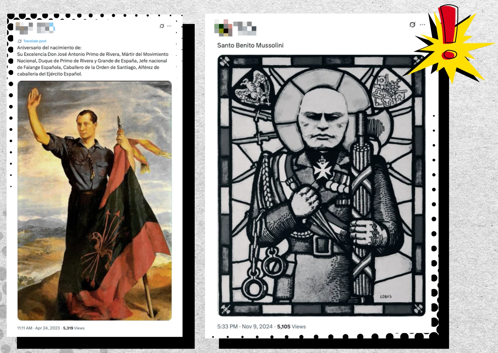 También hay una corriente de deificación o conversión de estas referencias en santos. “Existe mucha santificación de estas figuras históricas”, explica Key Allen, doctor en Relaciones Internacionales e investigador en la Universidad de Oxford y autor de múltiples artículos sobre extremismos y redes sociales. Especialmente, cuenta el experto, aquellas que fueron ejecutadas y se presentan “como una especie de mártires del neofascismo”. Así sucede, por ejemplo, con Benito Mussolini, que fue fusilado el 28 de abril de 1945 junto a su amante, Clara Petacci, para después ser expuestos y sometidos a todo tipo de vejaciones en una plaza de Milán; o Primo de Rivera, fusilado el 20 de noviembre de 1936 tras ser acusado de conspiración contra la Segunda República y rebelión militar.