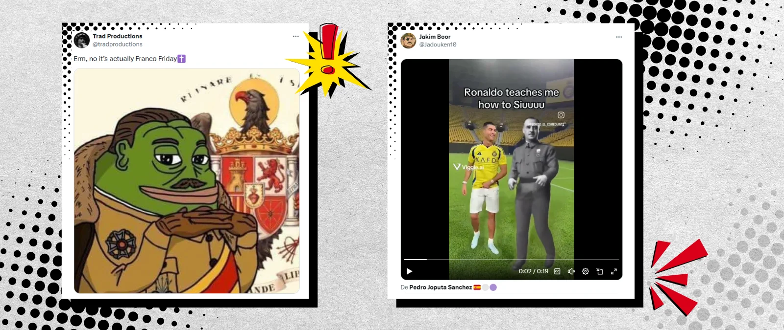 Franco caracterizado como una rana verde, la Rana Pepe, un personaje inofensivo del cómic Boy's Club creado por Matt Furie, que acabó convirtiéndose en un símbolo de odio; Mussolini y Franco bailando o Hitler imitando la celebración de Cristiano Ronaldo. Las imágenes tienen una capacidad de impacto emocional superior a la del texto escrito y quienes lo emplean son conocedores de ello.