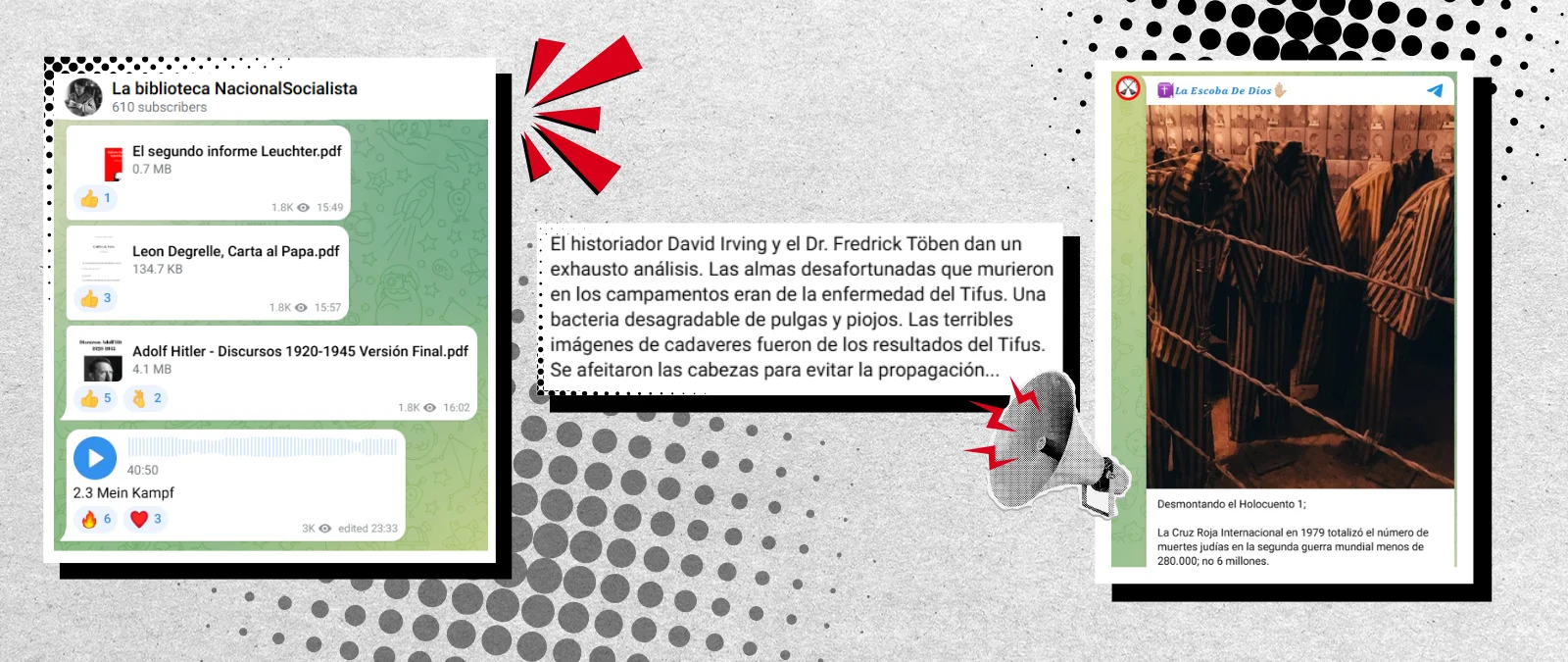 Los contenidos compartidos por esos canales de Telegram van desde capítulos del libro Mi Lucha, de Adolf Hitler, tanto en audio como en pdf, pasando por la negación del número de las víctimas del Holocausto (cifrado en alrededor de seis millones por organizaciones como el Museo del Holocausto de Estados Unidos), al que llaman “el holocuento” (u “holoverso”, “holo-lavado”, “holoengaño”), libros revisionistas que se distribuyen en pdf donde se pone en duda no sólo el número de víctimas sino la existencia de cámaras de gas en los campos de concentración nazis, algo que ha sido ampliamente documentado y estudiado. En esos libros, de libre descarga, se pueden leer frases como: “El cuento del horno crematorio presentado como cámara de gas es muy interesante, porque no habiéndose encontrado jamás cámara de gas en esos campos, es un truco al que se recurrió muy a menudo”.