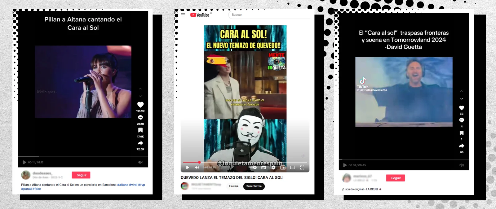 The soundtrack of pop fascism on social media spans all genres and has managed to adapt to current trends and technological advances. There's even room for less current, but no less mainstream, musical trends. Particularly common are posts using songs directly linked to Francoism, among which disinformation creeps in. A prime example is the wave of manipulated videos circulating on social networks that appear to show famous artists performing a modern version of Cara al Sol, the anthem of the Spanish Falange composed in 1935 and adopted in 1937 as the “national song” of Franco’s regime. We have identified altered videos of performances by singer Aitana, Quevedo, and DJ David Guetta.