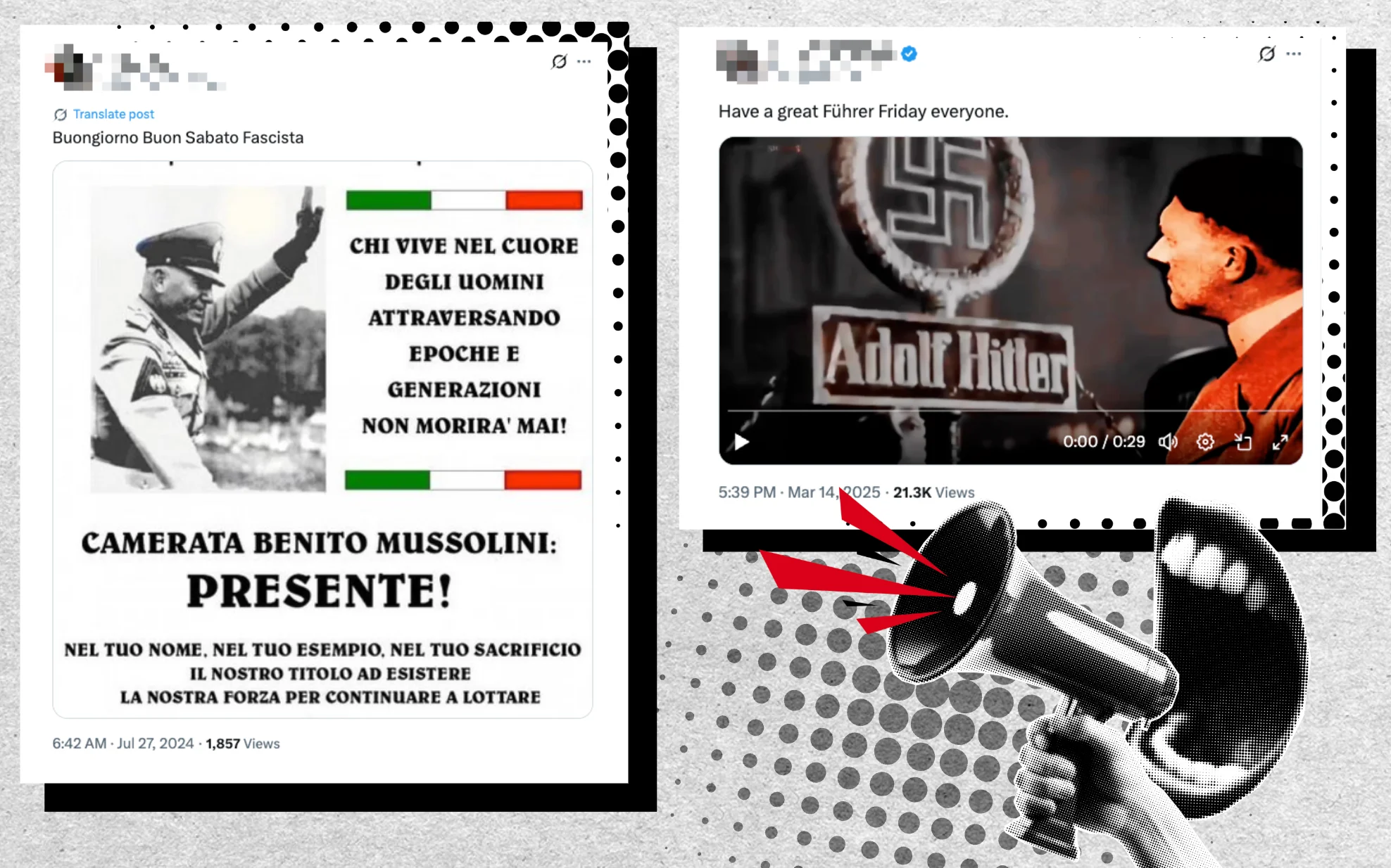 This text is part of a cross-border research project conducted by Maldita.es(Spain) and Facta(Italy) between June and September 2025. During this period, the focus was on collecting content from six platforms (Facebook, Instagram, Telegram, TikTok, X and YouTube), as well as from websites. In total, more than 500 pieces of content were recorded, from which we gathered various types of information such as: user, date of publication, format, language, and impact, among others. Only posts glorifying Francisco Franco, Benito Mussolini or Adolf Hitler, or the measures and policies implemented during their respective dictatorships, or associated symbolism were selected. These contents were analysed individually. From this analysis, the most frequently repeated terms and emojis were extracted, in order to then study their possible hidden meaning within this movement. Various academic studies and expert publications were consulted to better understand their meaning.