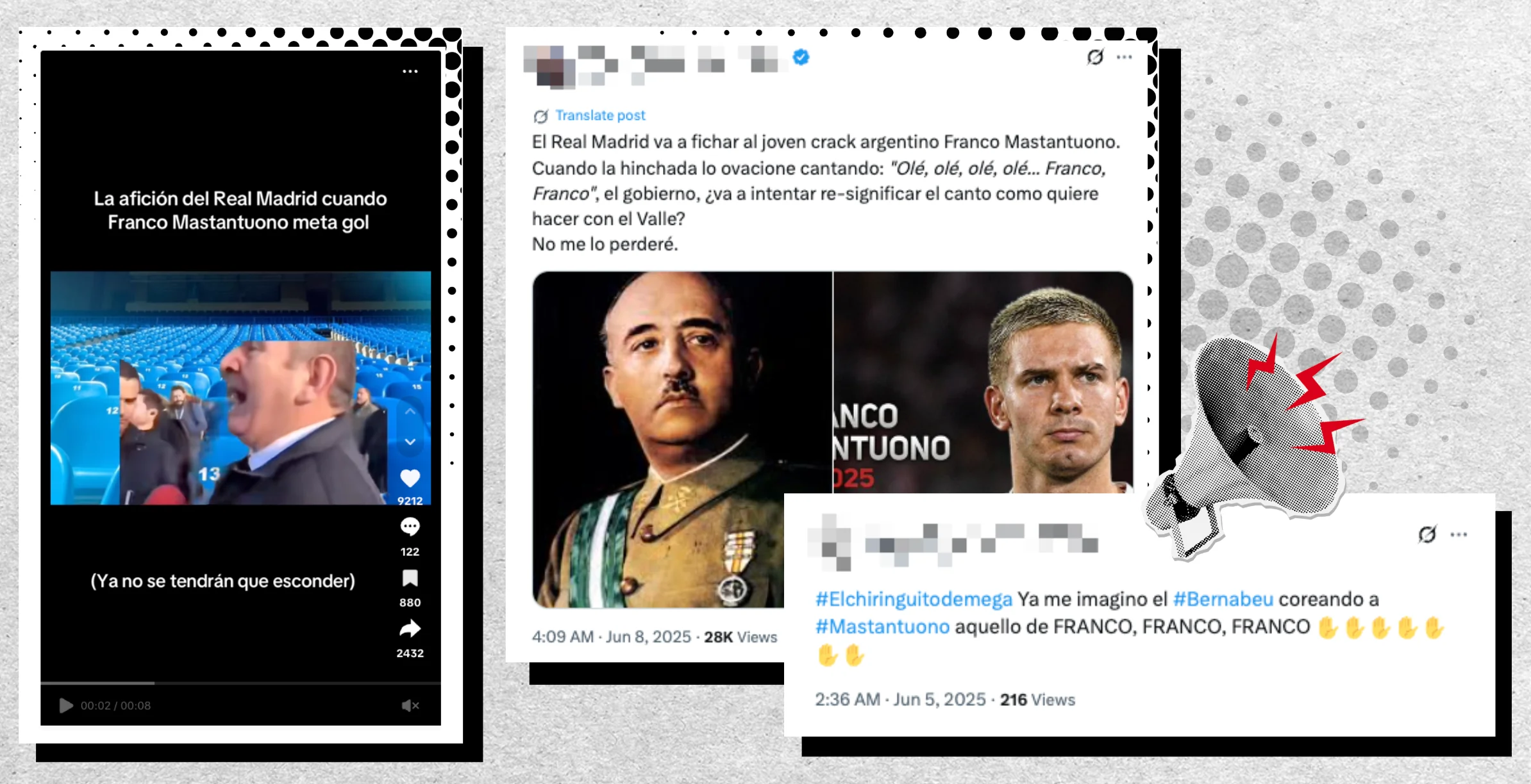Football is another sphere where dictators are glorified, often by exploiting current events, signings or viral moments. The names and faces of players are used as pretexts to talk about Franco, Hitler or Mussolini. The most notable recent example in Spain involves Franco Mastantuono, an 18-year-old Argentine footballer who signed with Real Madrid during the 2025 summer transfer window. Before the deal was officially confirmed, speculation about his future spread across social media, accompanied by dozens of posts ‘jokingly’ referencing Francisco Franco and the Francoist dictatorship, capitalising on the coincidence of names.