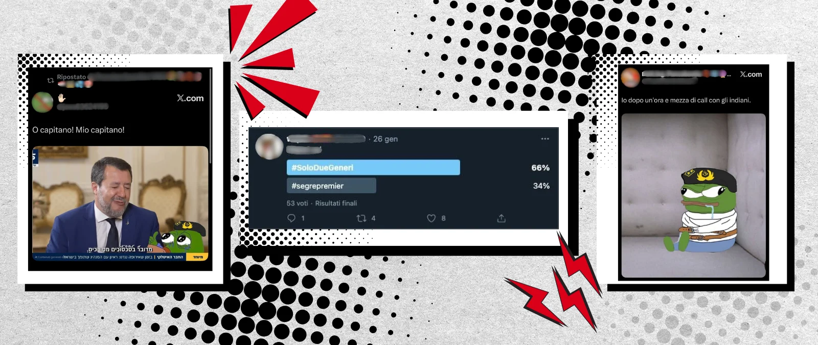 In Italy, Facta identified a particularly striking case in 2021: a network known as the Mattonisti (“bricklayers”) on X, a group of several hundred Italian accounts coordinated with each other. Behind these accounts, Facta explains, lies an organised Telegram channel where users coordinate which hashtags to push into trending topics, using current events to amplify reactionary content and normalise fascist and Nazi symbols. Their hallmark is the use of Wojak, a crudely drawn meme character used as a mask to represent negative emotions such as sadness and melancholy. In the Mattonisti ecosystem, Wojak becomes Mussolini or Hitler, transforming historical figures into pop icons with powerful visual appeal.