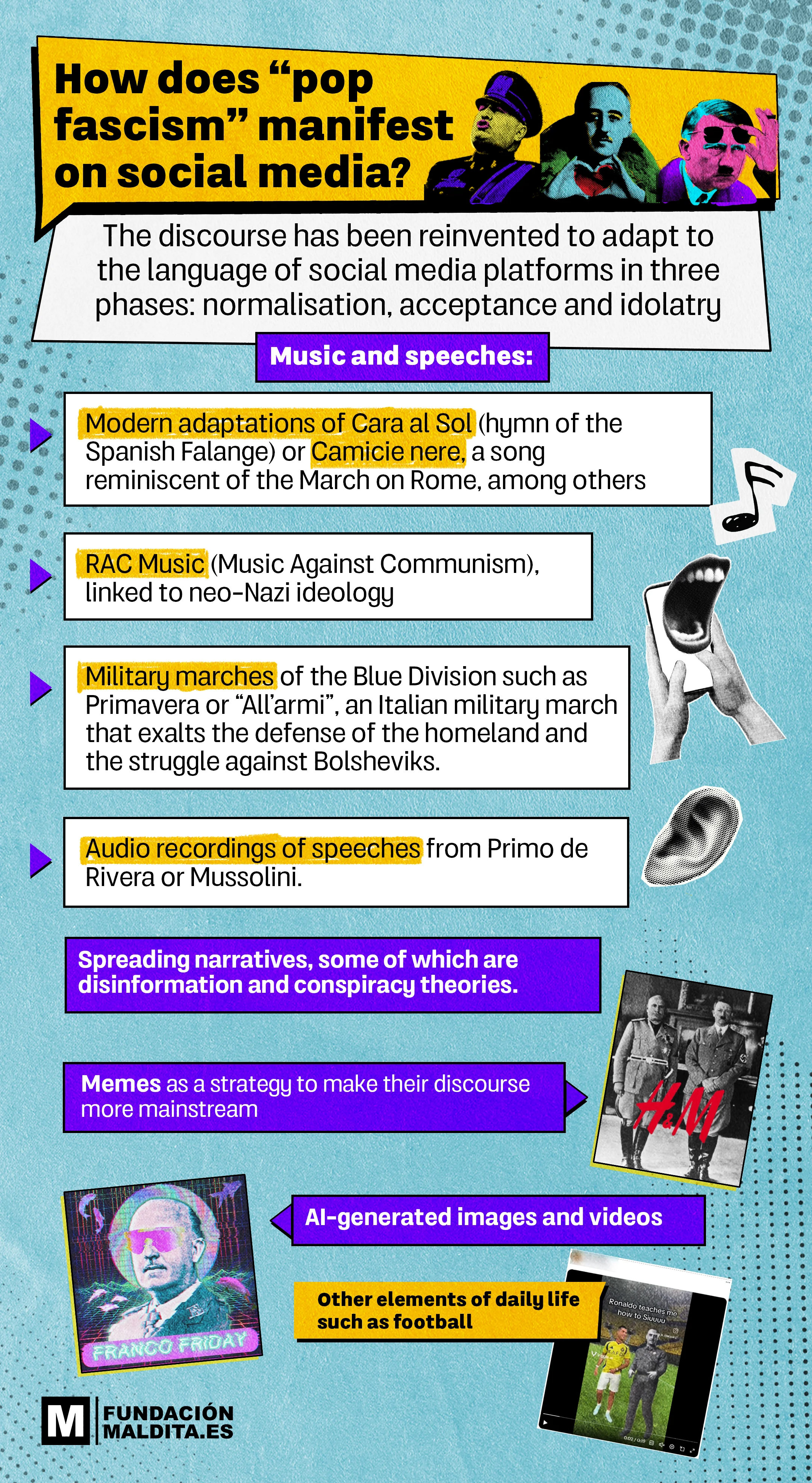 The celebration of Franco Fridays on X (formerly Twitter), Führer Days or Fascist Saturdays instituted by Mussolini in 1935, and the use of Blas Piñar and Primo de Rivera speeches in TikTok videos all contribute to the idolisation of these figures. And all of this content has already spread across social media with varying degrees of coordination and behavior depending on the platform. It's ‘pop fascism,’ and it seeps into our daily lives through multiple elements of contemporary culture.